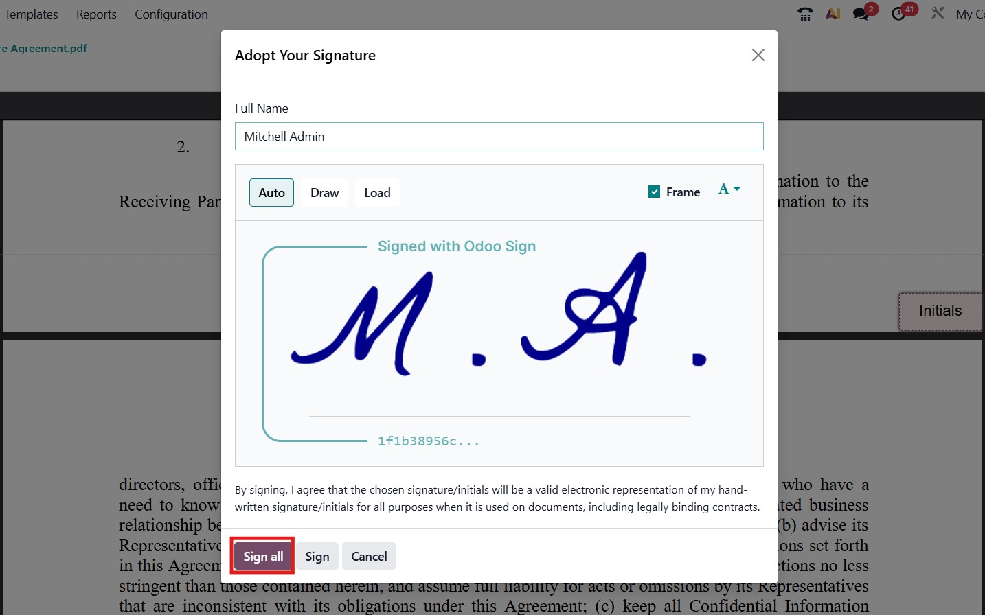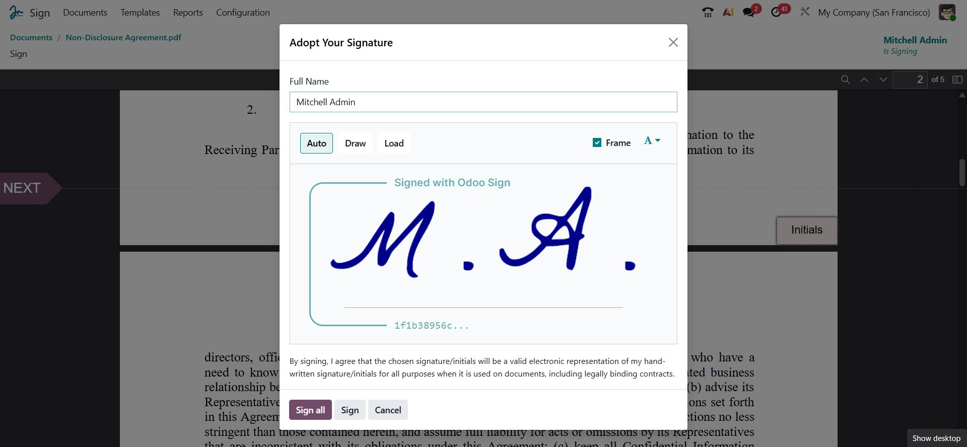 The system navigates you from the beginning of the document to the end in a structured, step-by-step manner. Once you complete one field, Odoo immediately highlights the next one to maintain a smooth workflow. When you reach a signature field, a dedicated pop-up window will appear, allowing you to add your digital signature directly within the document.