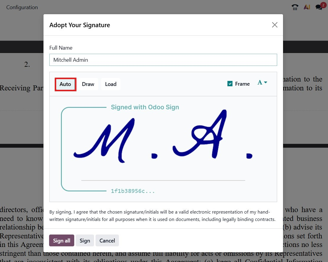 The next option available is the Auto signature mode. In this option, Odoo automatically generates a digital signature based on the signer’s full name. The system offers a variety of predefined signature styles to choose from, allowing the user to select the one that best suits their preference. This feature ensures a quick and professional signing experience without the need to draw or upload a signature manually.