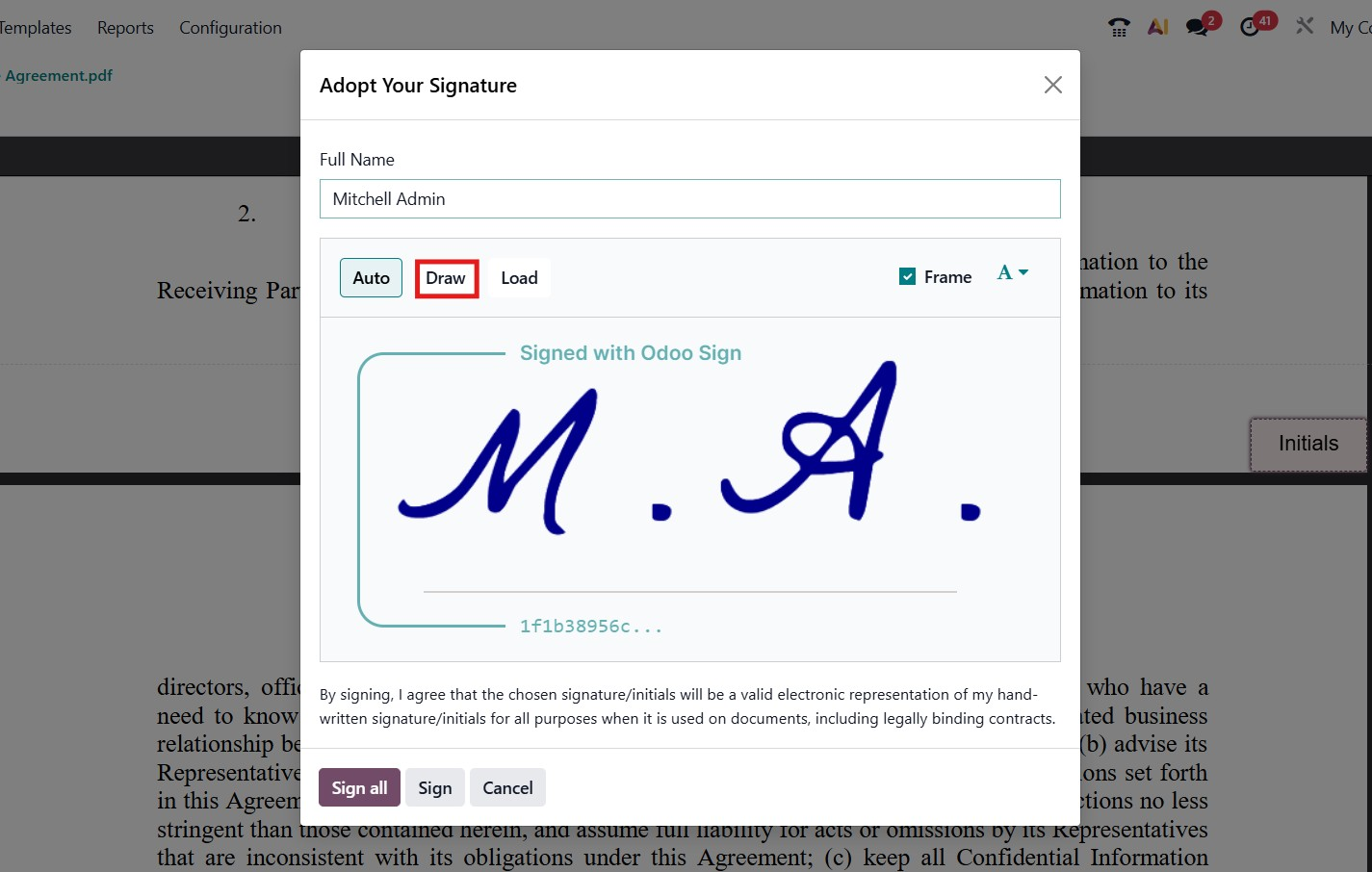 You can start by filling out the Full Name field by typing your complete name. Once entered, you can proceed to sign the document. Odoo 19 provides a variety of signature options, allowing you to personalize your signature according to your preference. By selecting the Draw option, you can manually create your signature using a mouse, digital pen, or touch input device directly within the pop-up window. This flexibility ensures that each signer can easily provide a signature in a format that feels natural and authentic.