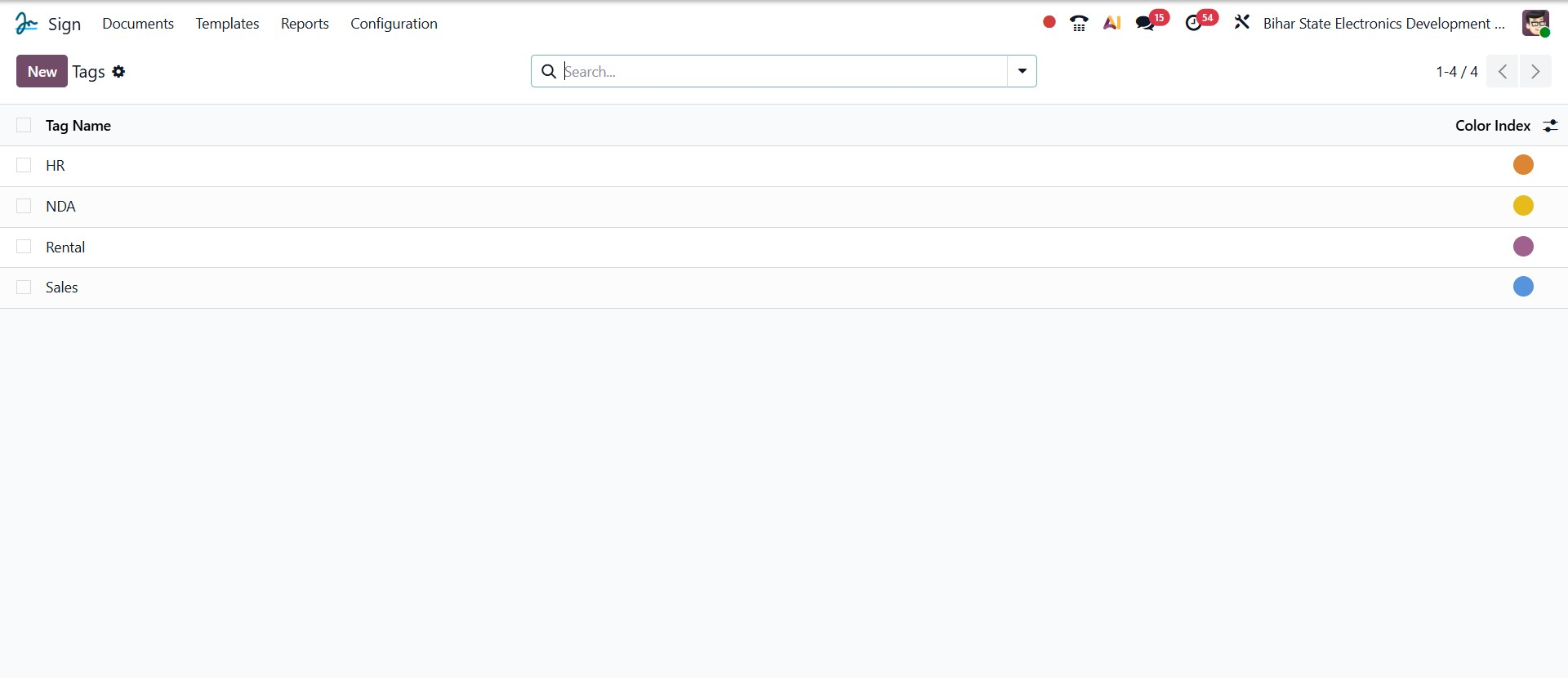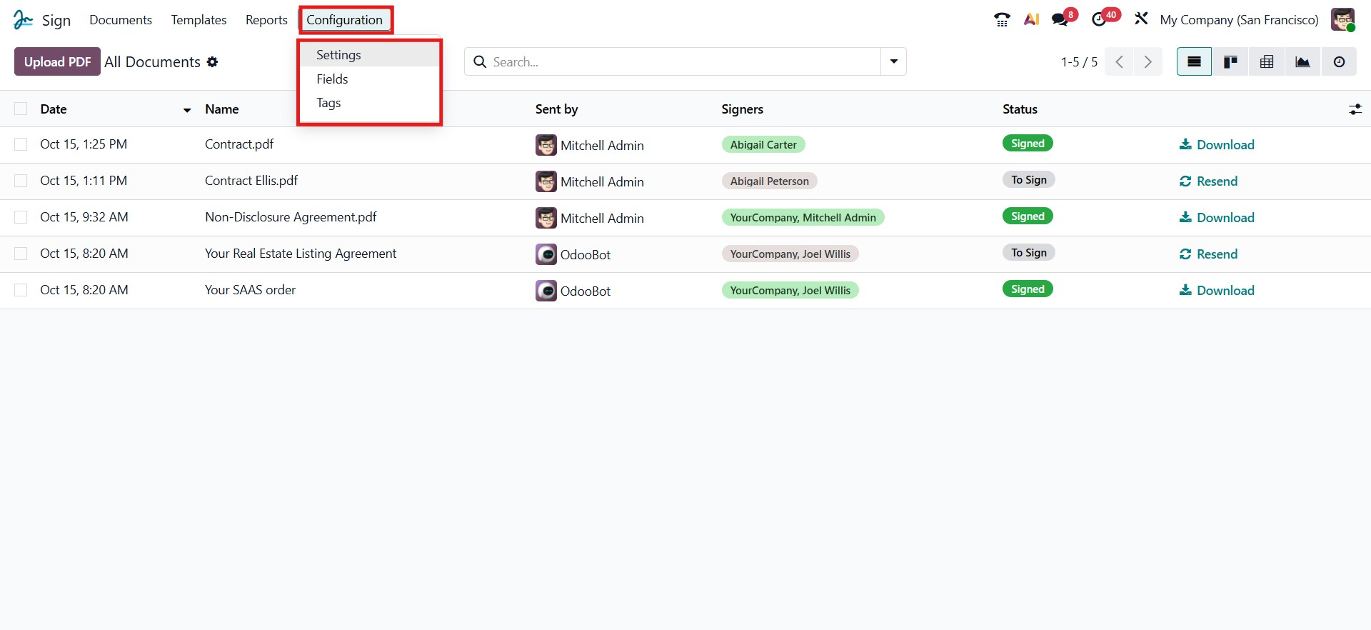 The Configuration tab in the Odoo 19 Sign module provides access to several essential options that help streamline the document signing process. The Settings menu allows you to configure general preferences for the module, while Fields lets you define the types of fields that can be added to documents, such as text, date, or signature fields, and the Tags option helps organize and categorize documents for easier tracking and retrieval. Together, these configuration options make it easier to manage, structure, and automate your document signing processes efficiently.
