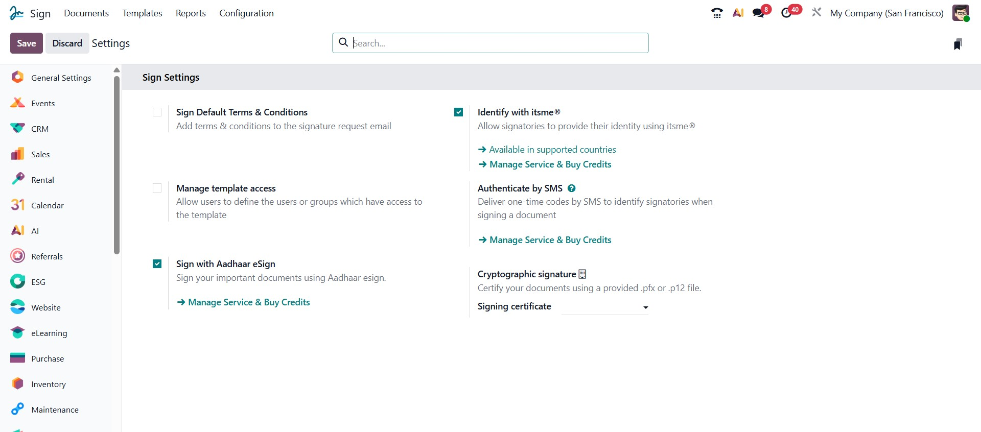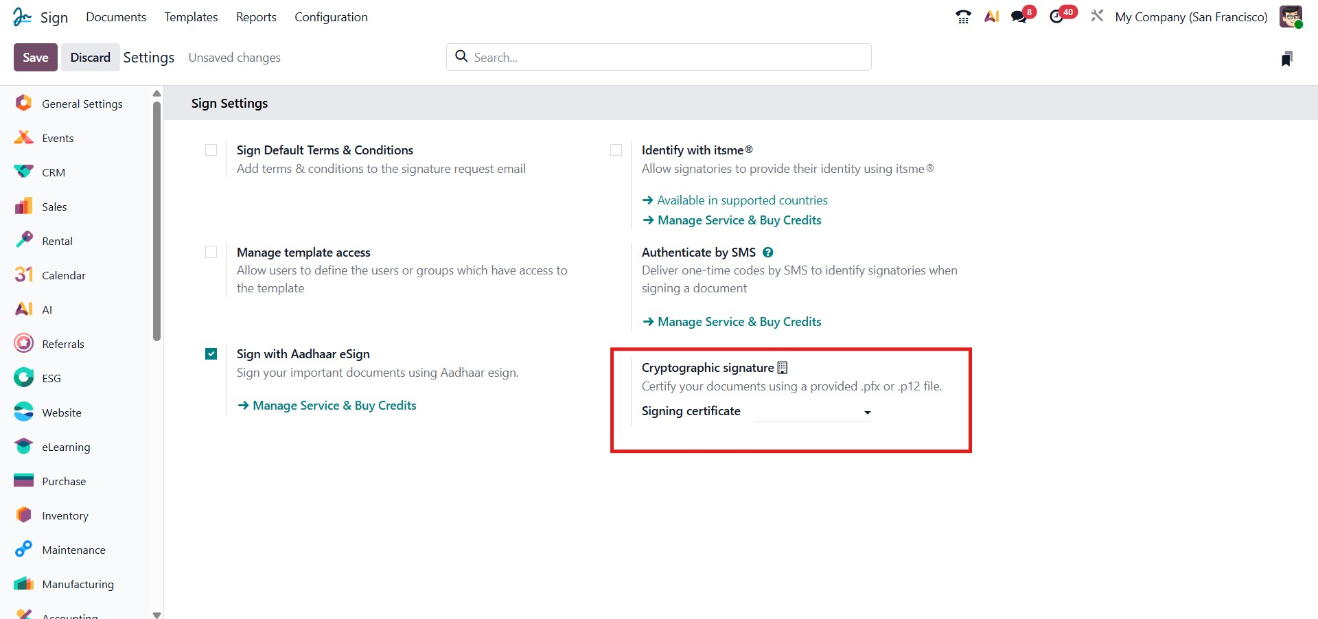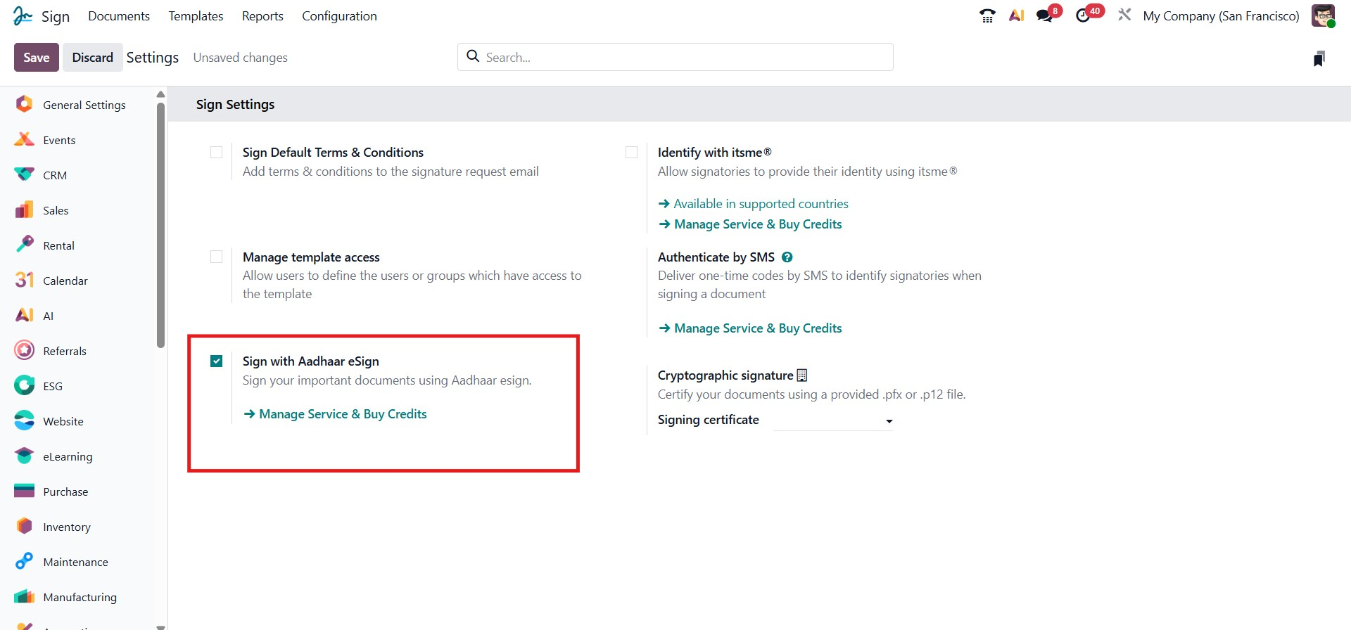 This Sign with Aadhaar eSign option enables signing official documents using Aadhaar eSign, a government-authorized digital signing method in India. When activated, Odoo integrates with the Aadhaar eSign service, allowing users to securely authenticate and sign using their Aadhaar credentials.