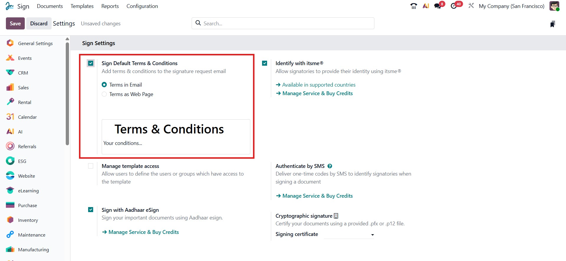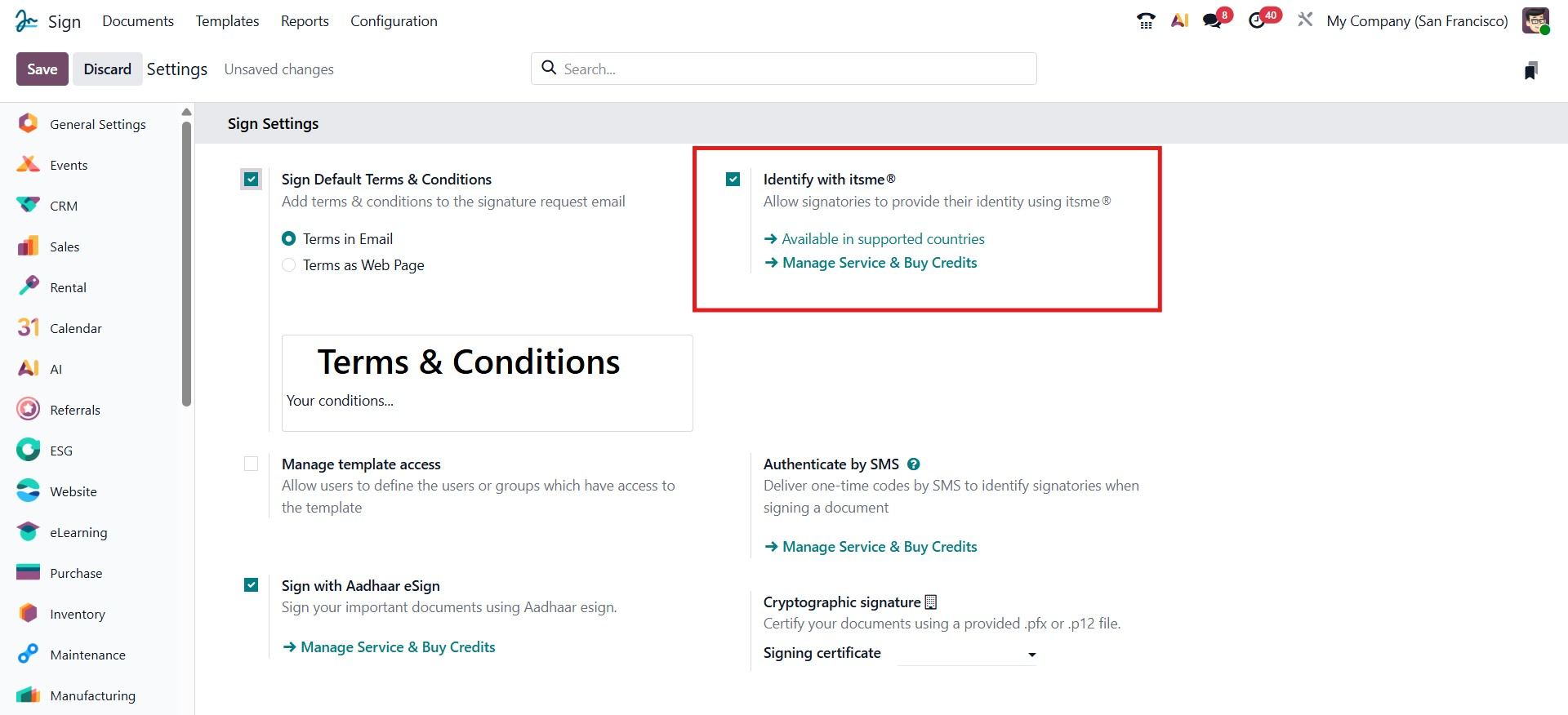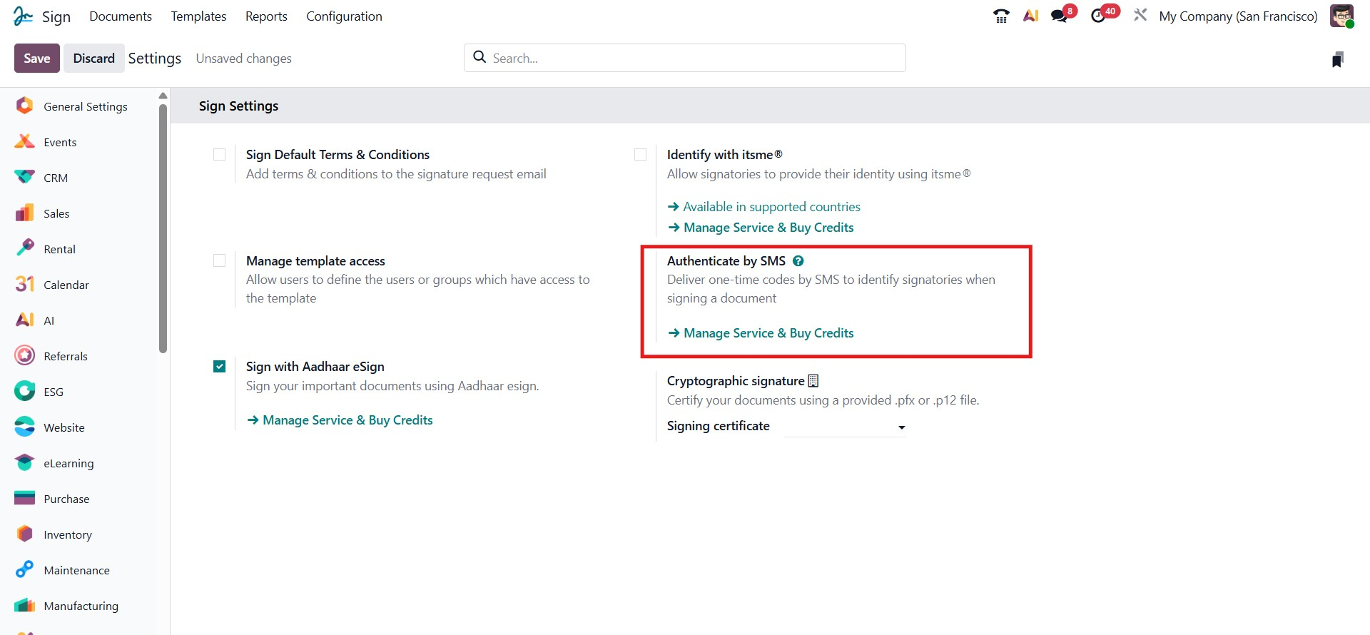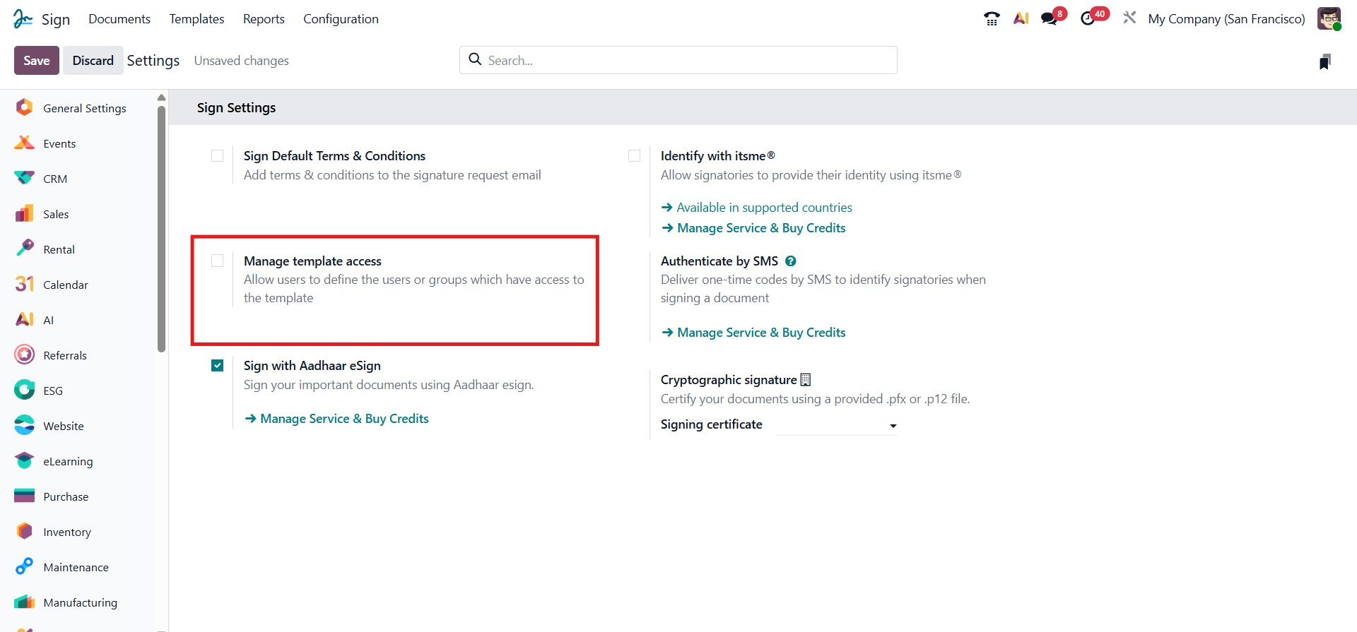 This Sign with Aadhaar eSign option enables signing official documents using Aadhaar eSign, a government-authorized digital signing method in India. When activated, Odoo integrates with the Aadhaar eSign service, allowing users to securely authenticate and sign using their Aadhaar credentials.