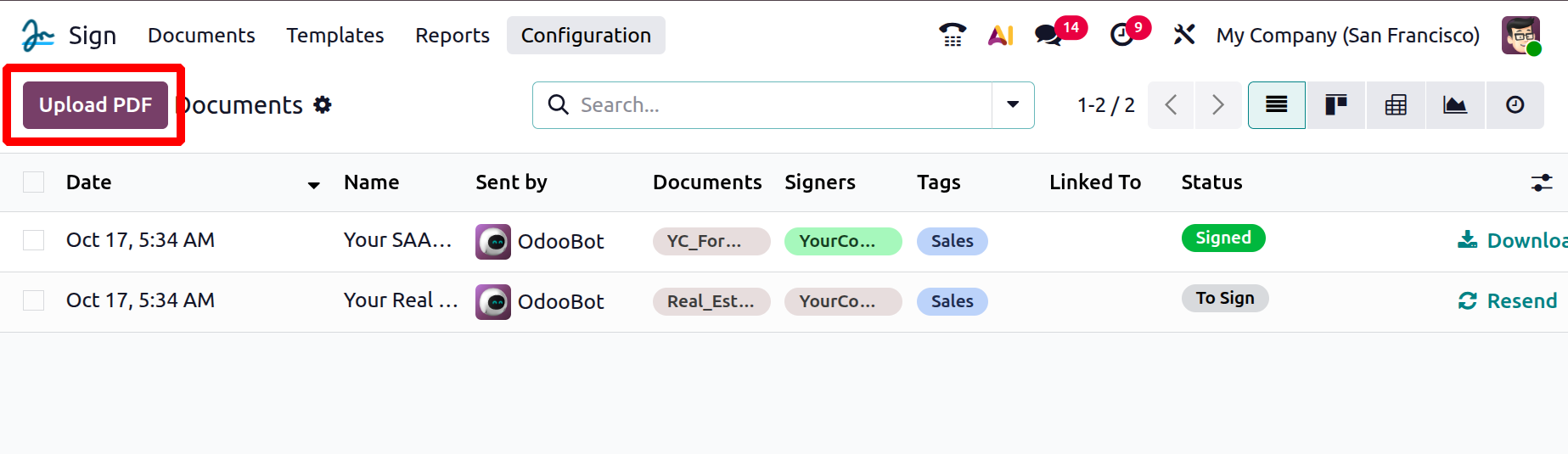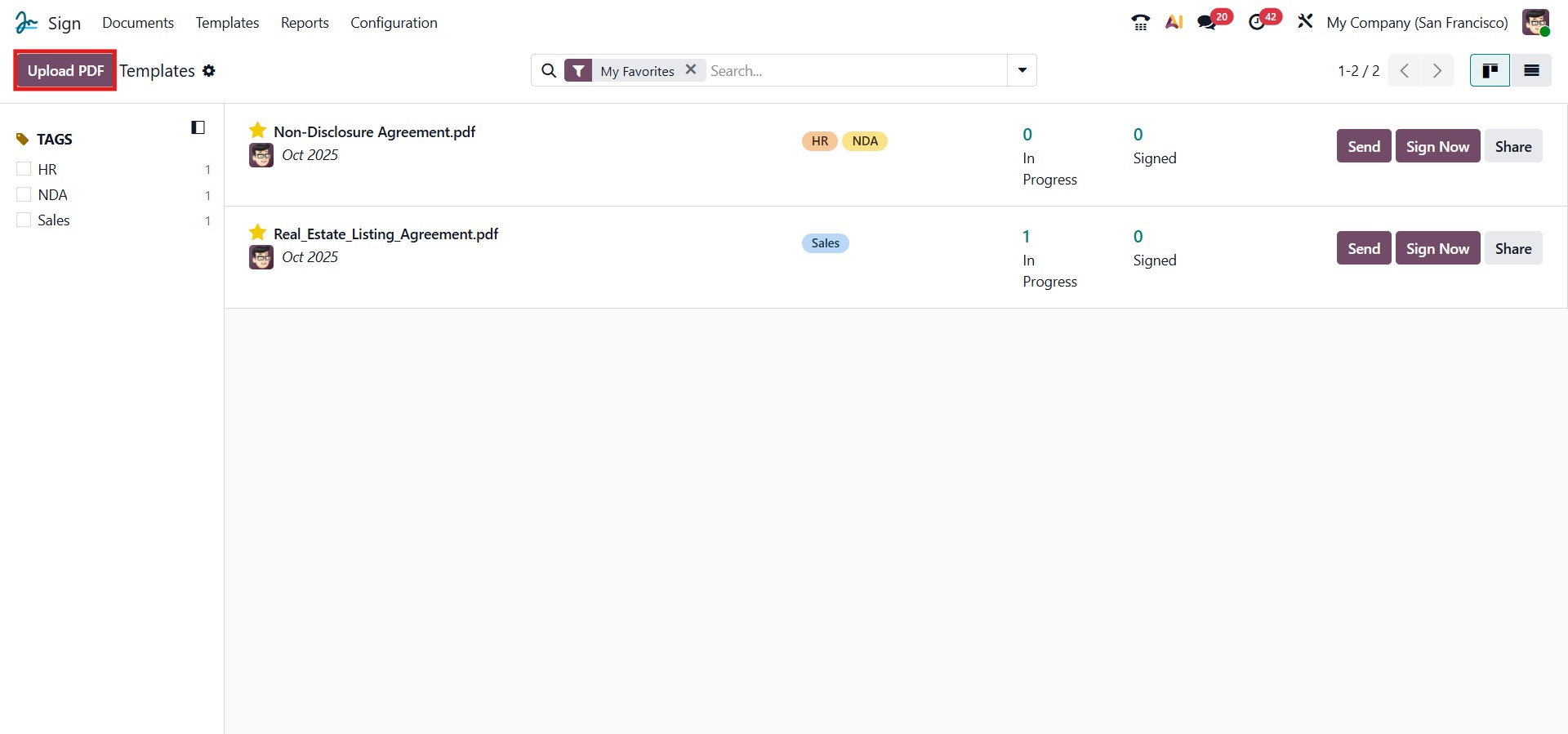 In Odoo 19, selecting the Upload PDF button not only allows you to upload a new document but also enables you to update an existing PDF template. This feature is useful when you need to modify or replace a document template that is already in use, ensuring that the latest version is available for future signature requests.