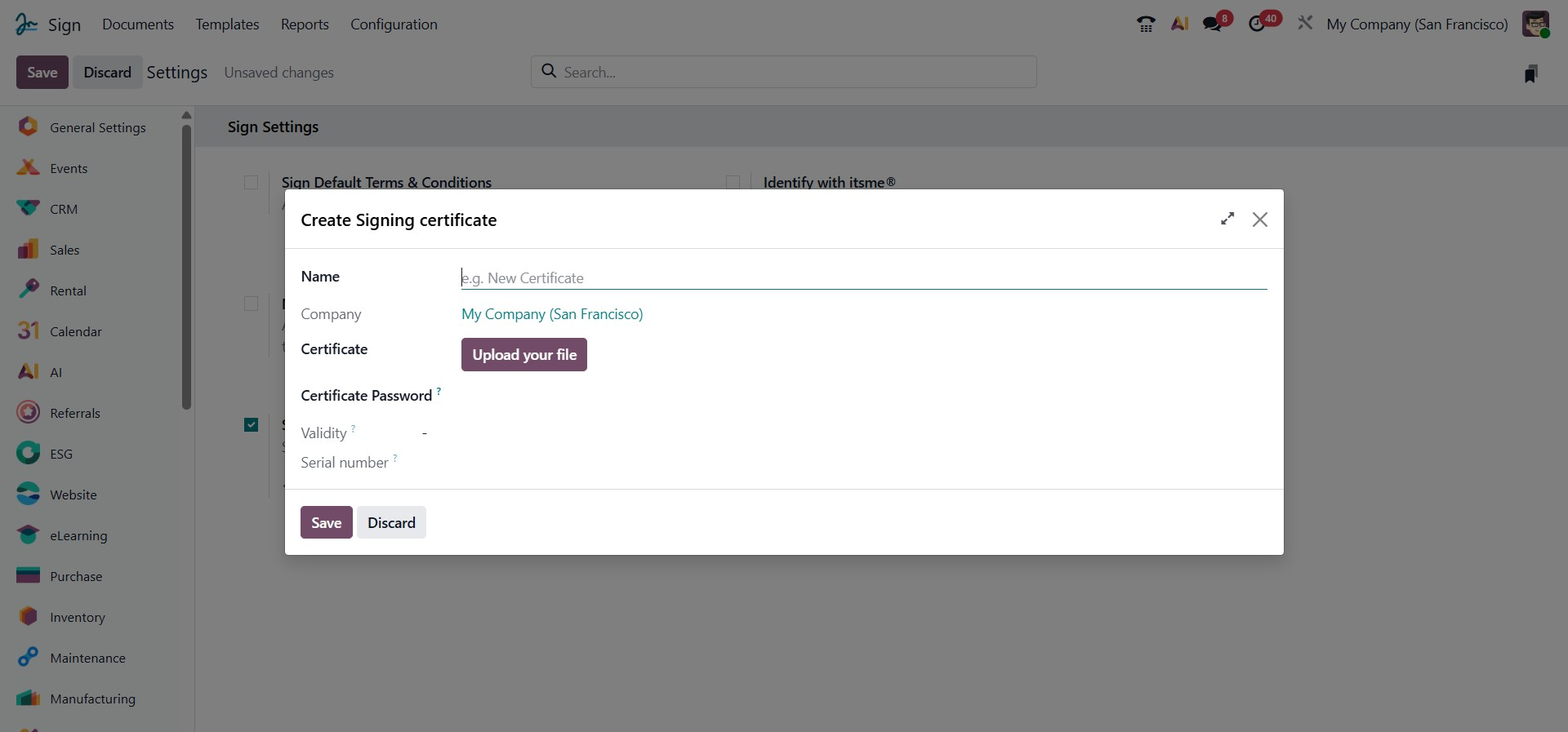 The name must be specified for the certificate record, helping differentiate multiple certificates used within the organization. The company field determines which company the certificate belongs to, ensuring proper access control in multi-company setups. Next, the certificate file in .pfx or .p12 format must be uploaded using the Upload your file button. The certificate password associated with the uploaded file is then entered to decrypt the private key during the signing process. Once the file is uploaded, Odoo automatically detects and displays the validity period of the certificate, indicating its start and expiry dates, as well as the serial number, which uniquely identifies the certificate and aids in verification or audits. After all details are reviewed, clicking Save confirms and stores the certificate for use in document signing, while Discard cancels the process without saving any data.