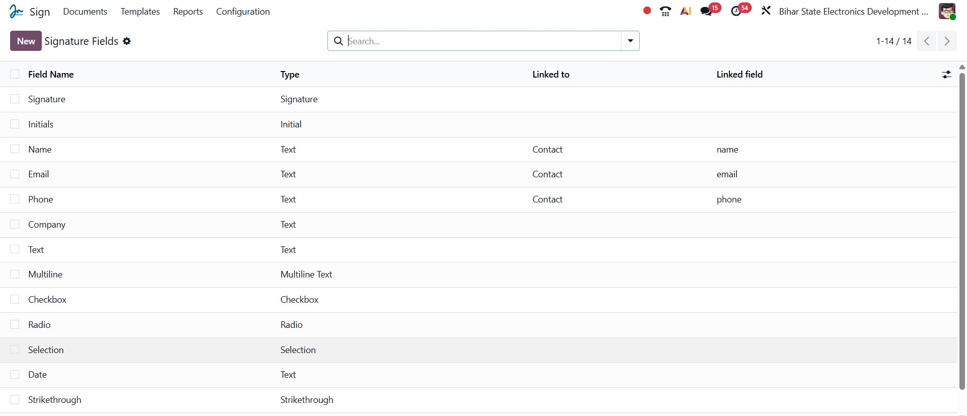 All configured signature fields can be viewed and managed under the Configuration, Signature Fields menu, as shown in the image below. From this section, users can review existing fields or create new ones by clicking the New button.