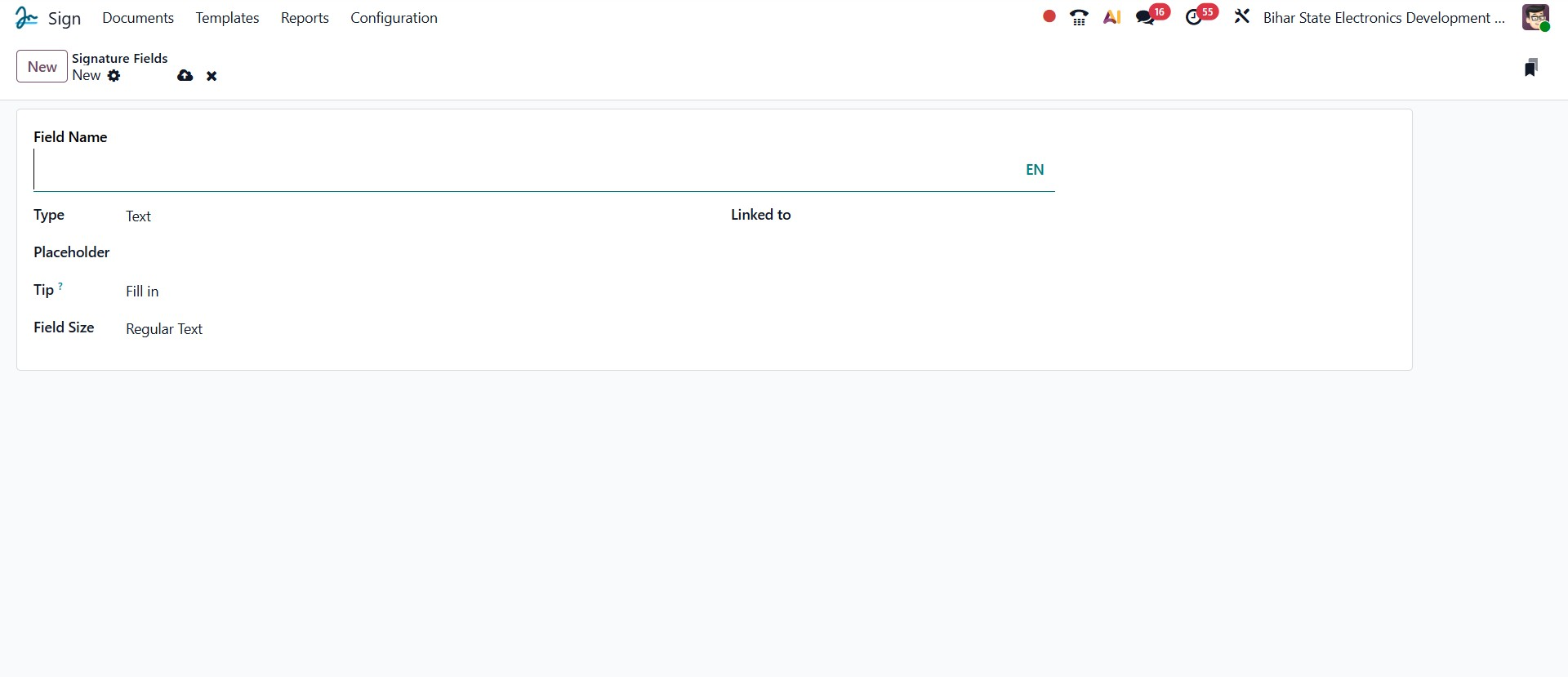 To add a new field, enter the Field Name and choose the Type from the dropdown list. The available field types include Signature, Initial, Text, Multiline Text, Checkbox, Radio, Selection, Strikethrough, and Stamp. You can also specify a Placeholder to guide users on what to enter and add a Tip for additional instructions or context. The Field Size option lets you set the preferred display size for the text field. Additionally, the Linked To field allows you to associate the signature field with specific data models, such as Account, Applicant, Appointment Type, and more. This feature enables Odoo to automatically fetch and populate relevant information when documents are signed, enhancing automation and accuracy.