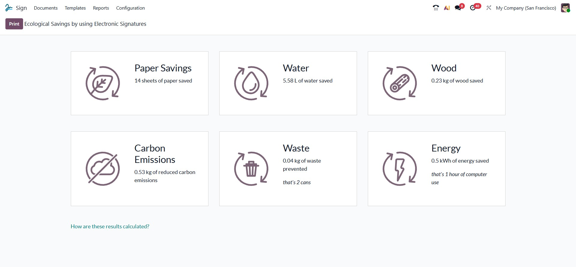 The Reports menu in Odoo 19’s Sign module displays the environmental benefits of using digital signatures. It summarizes key savings such as reduced paper, water, energy, waste, carbon footprint, and wood usage, showing how electronic signing supports sustainability. A link titled “How are these results calculated?” explains the methods and criteria behind these figures, ensuring transparency. This feature helps organizations not only streamline document signing but also track and promote their eco-friendly impact, as shown in the figure below.