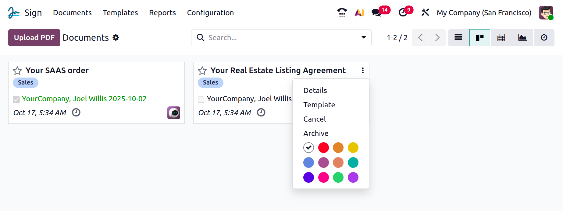 Each record in the Kanban view includes a dropdown menu that provides quick access to useful actions. By clicking on the three-dot icon in the top-right corner of a document card, users can perform various operations such as Details, Template, Cancel, and Archive. You can also assign color labels to your document cards, helping you categorize and identify them quickly. Using color coding is especially helpful when working with multiple contracts, agreements, or forms, as it adds a clear visual distinction between different types of documents.