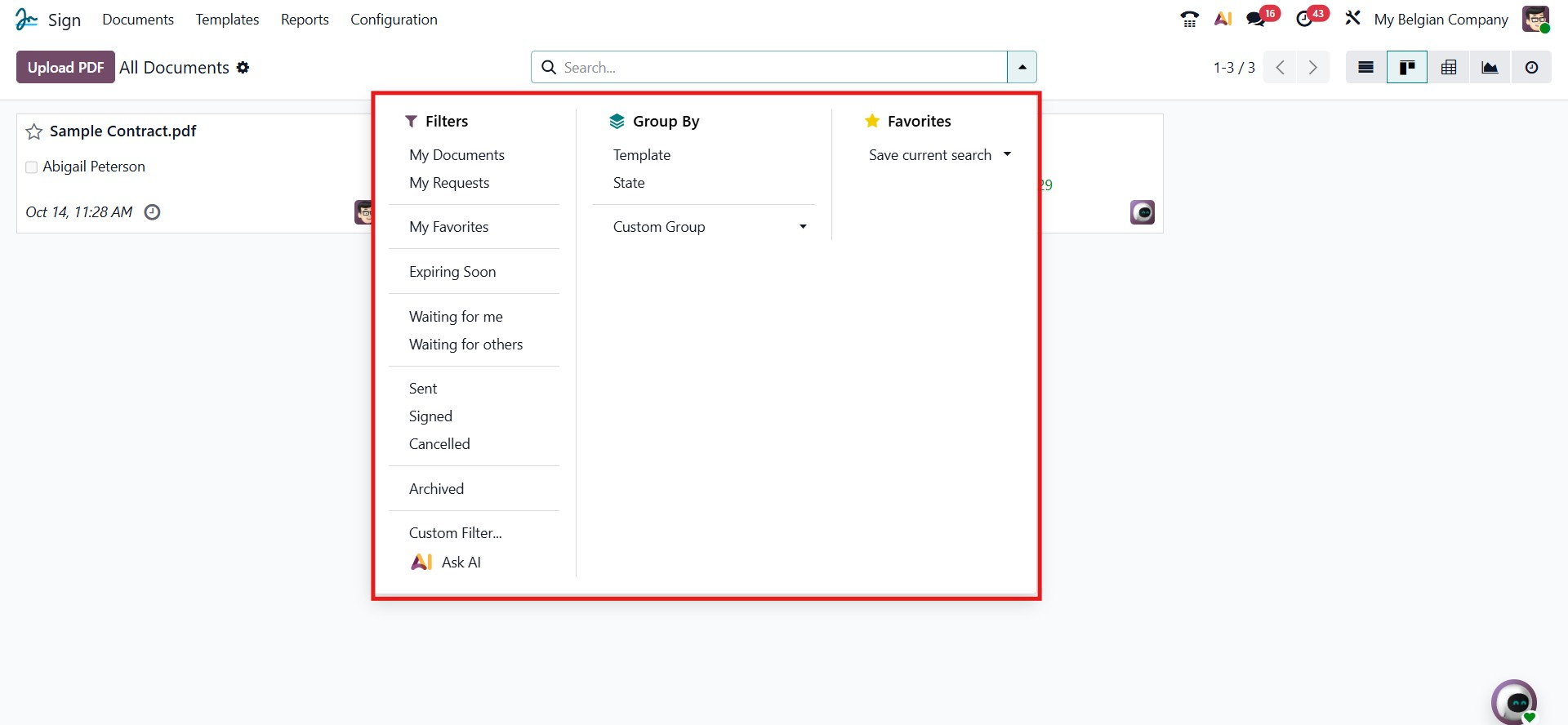At the top of the All Documents window in the Sign module, users can find the Filters, Group By, and Favorites options, along with the Search bar. These tools help users easily sort, categorize, and locate specific sign requests or documents. Under the Filters menu, Odoo 19 now includes several predefined options such as My Documents, My Requests, My Favorites, Expiring Soon, Waiting for Me, Waiting for Others, Sent, Signed, Cancelled, and Archived. Users can also create a Custom Filter or use the new Ask AI option for intelligent search assistance. The Group By menu allows documents to be grouped by Template or State, while the Favorites menu lets users save current searches for future reuse.