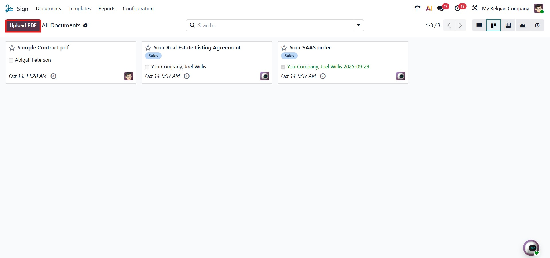 You can upload a new document for signing by clicking the Upload PDF button located at the top left of the Sign dashboard. This option allows you to select and upload a PDF file directly from your computer. Once uploaded, you can review the document and add the required signature fields. To digitally sign the document, simply select the uploaded file and proceed with the signing process within Odoo.