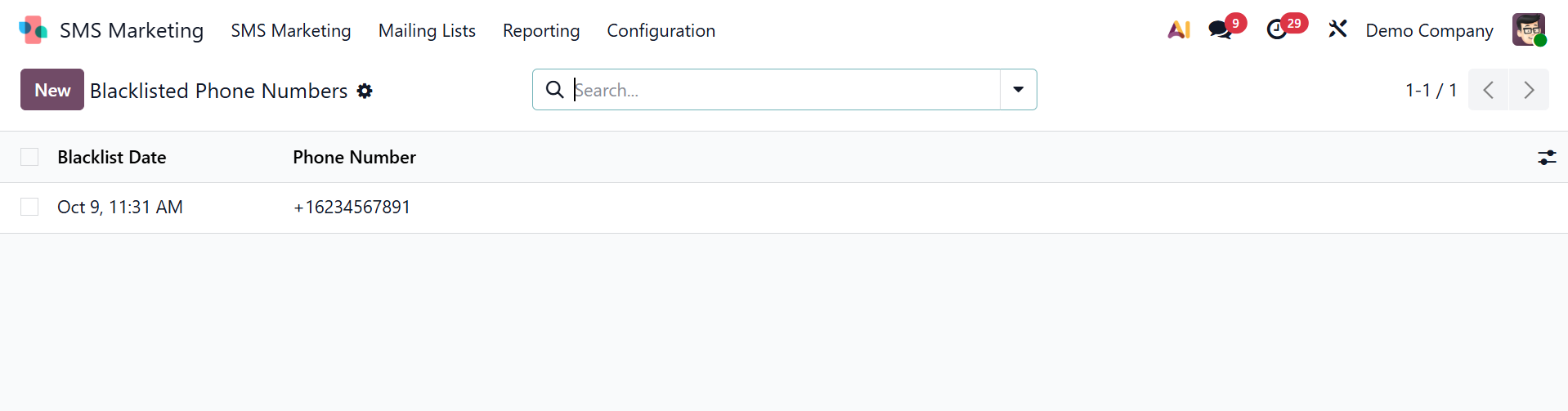 Numbers that are already on a blacklist will be indicated here. The Filters and Group By options make it simple to manage and sort the entries. Clicking the New button on the left-hand side of the page will open a new entry form where you may add a new number to the blacklist.