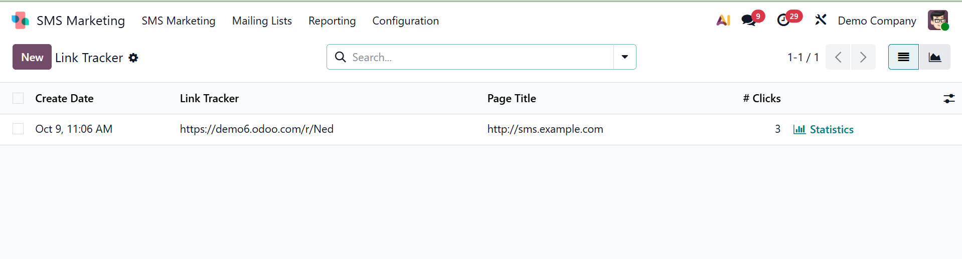 Monitoring user engagement is crucial as SMS marketing becomes more relevant and has higher open rates. You can monitor click-through rates and evaluate the success of your SMS campaigns with Odoo's Link Tracker tool in the SMS Marketing module. The Configuration menu, which is situated directly beneath the Blacklisted Phone Numbers section, offers this option.