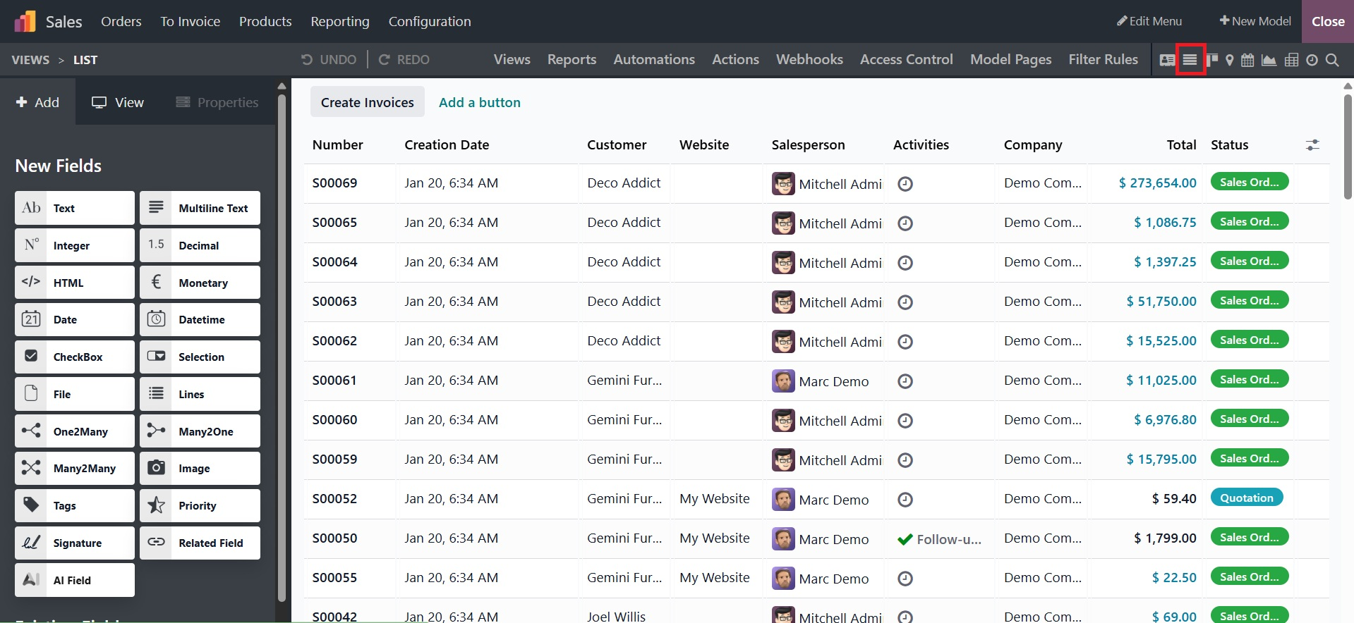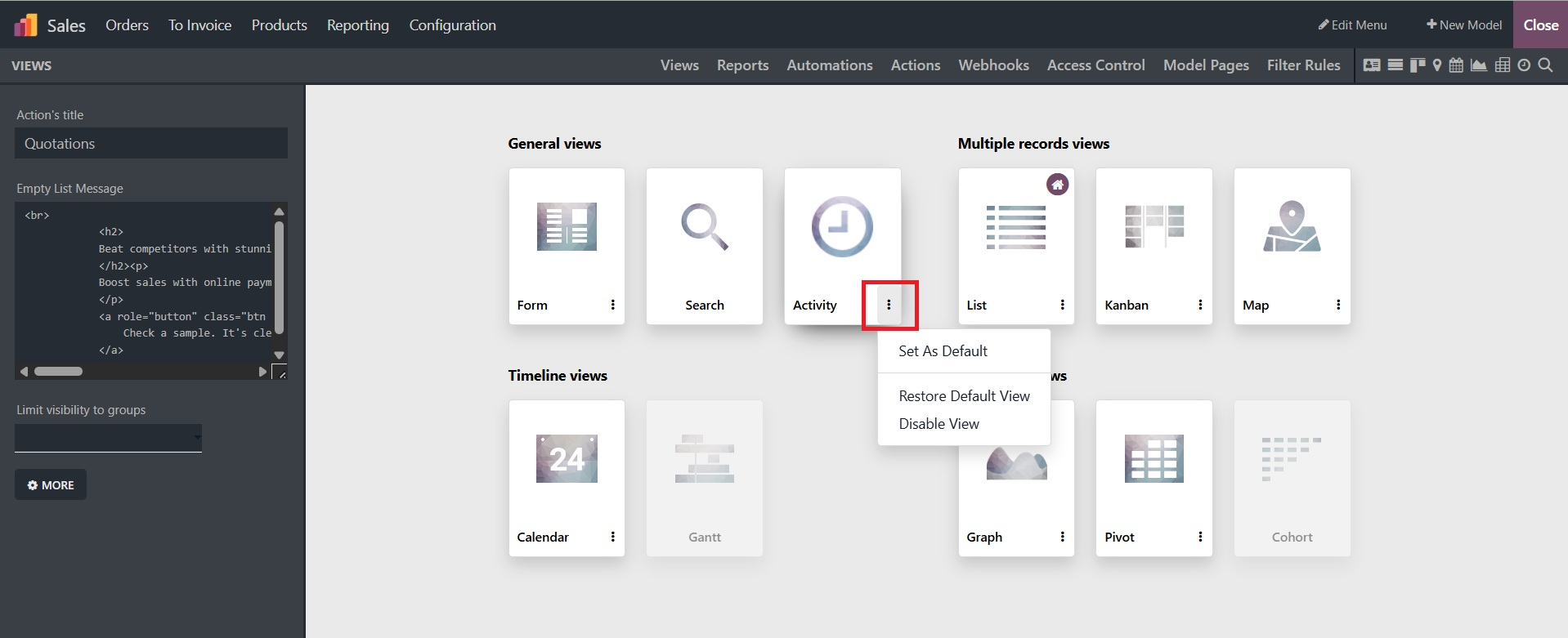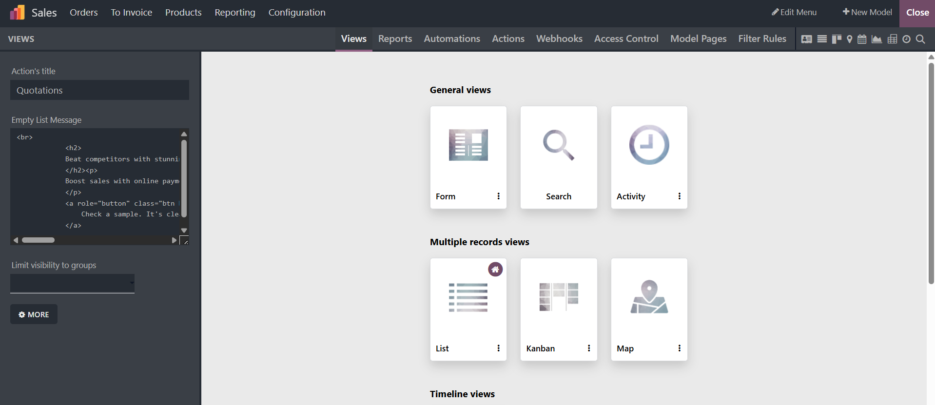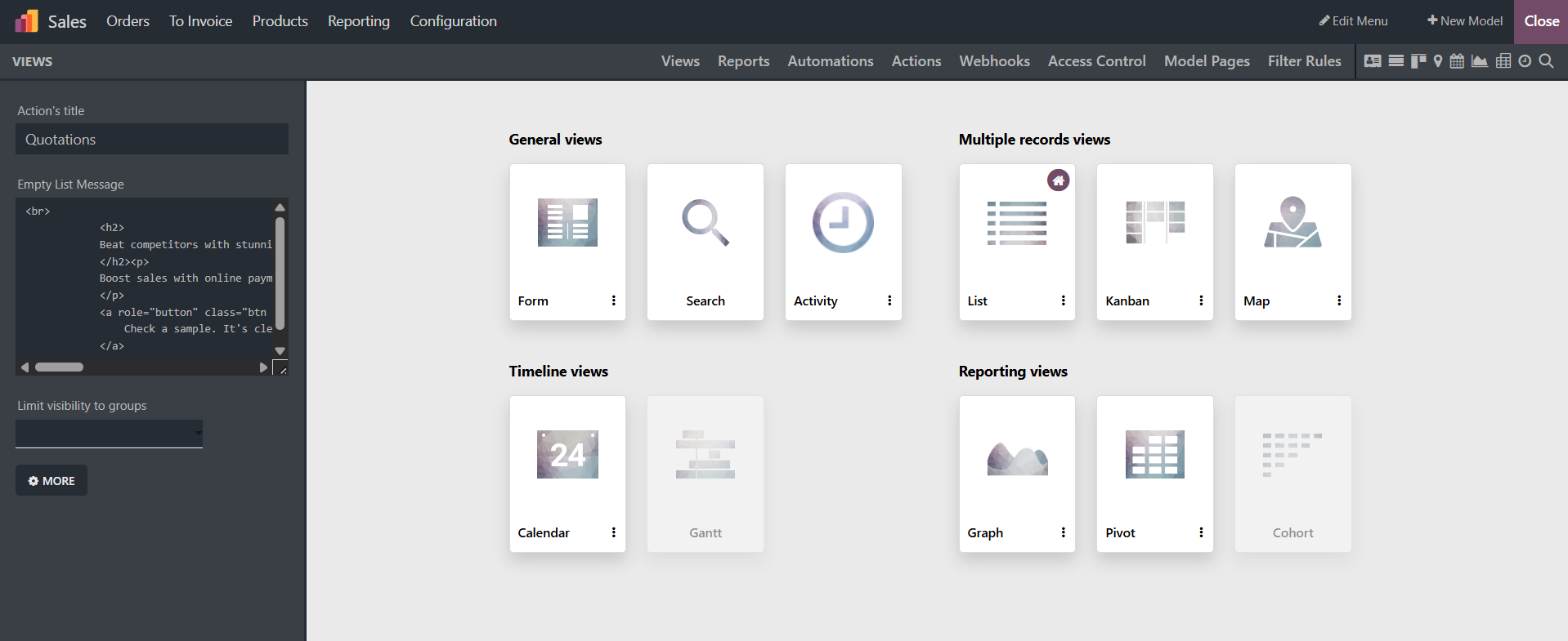 As seen in the picture below, you are given a variety of perspectives. Applications' usefulness and aesthetic appeal can be improved by creating a variety of Views using the Odoo Studio Module Views menu. This menu contains views from the General Views, Multiple Record Views, Timeline Views, and Reporting View categories.