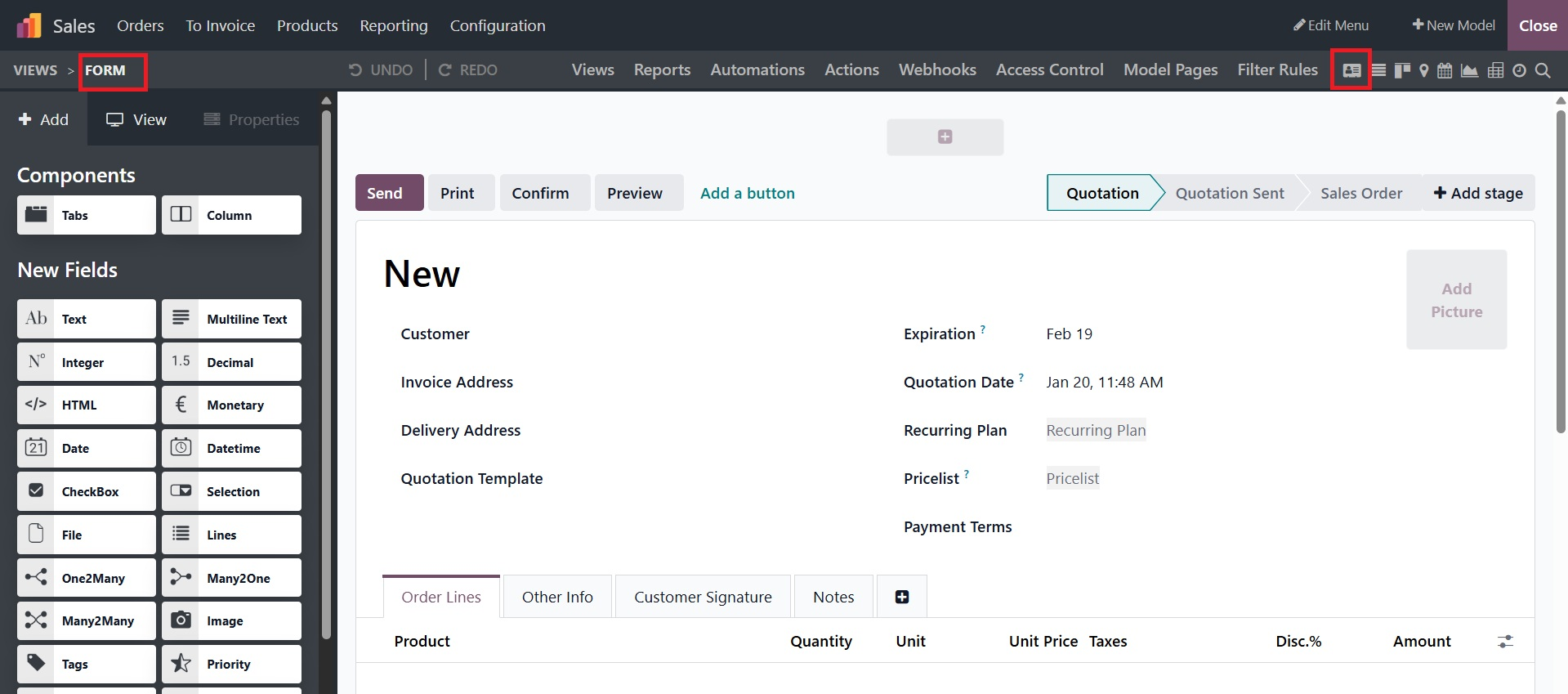 The Odoo19 Studio Module Views menu can be used to create multiple views for the apps menu; by default, the special Views will help draw more attention and provide information from the various menus, both of which will be quite beneficial. Views like Form, Search, and Activity View can be used to define the menu views; features of the Form View include the form's title, buttons for modifying the form according to operational needs, and a Print button that will print the Form View from the window immediately if paper format data is required.