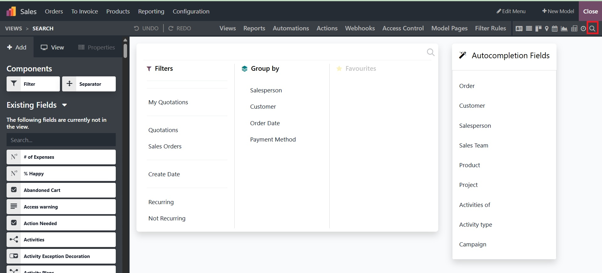 The various Filtering components can be shown and positioned under the "Search" window in Odoo Studio, where these tools can be used to arrange the key components. Thanks to the customization features that enable the Filter options to be specified, the user has complete discretion over how to use the Filter tool.