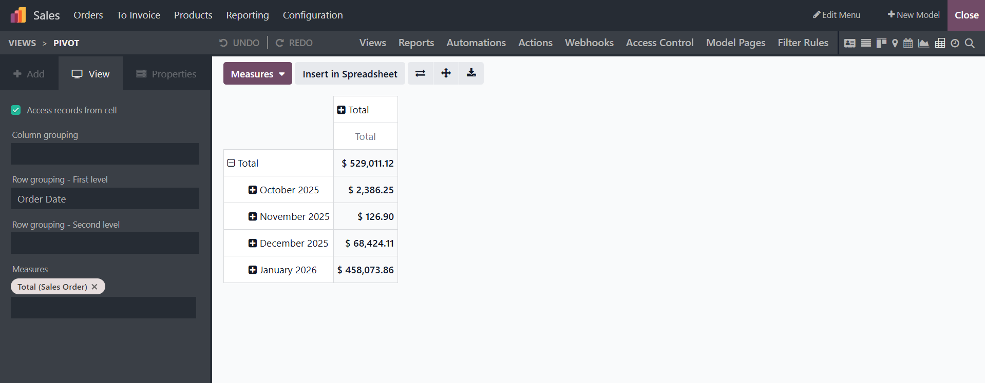 By turning on the "Access records from cell" option, users can retrieve the data records from a pivot table. Depending on the circumstances, the Pivot View can activate features like Column grouping, Row grouping-First level, Row grouping-Second level, Measures, and the Display count.