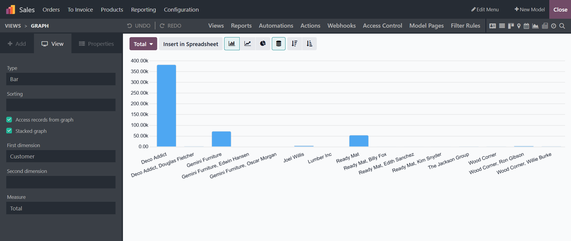 Bar, line, or pie charts are used to display data in the Graph view. First and Second Dimensions, Measures, Graph types, and Sorting choices are all included in the "Graph" view. Throughout the building process, users can choose to add more dimensions.