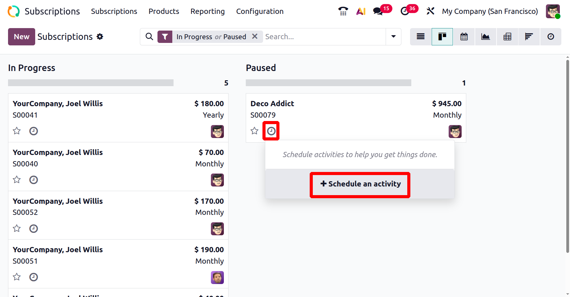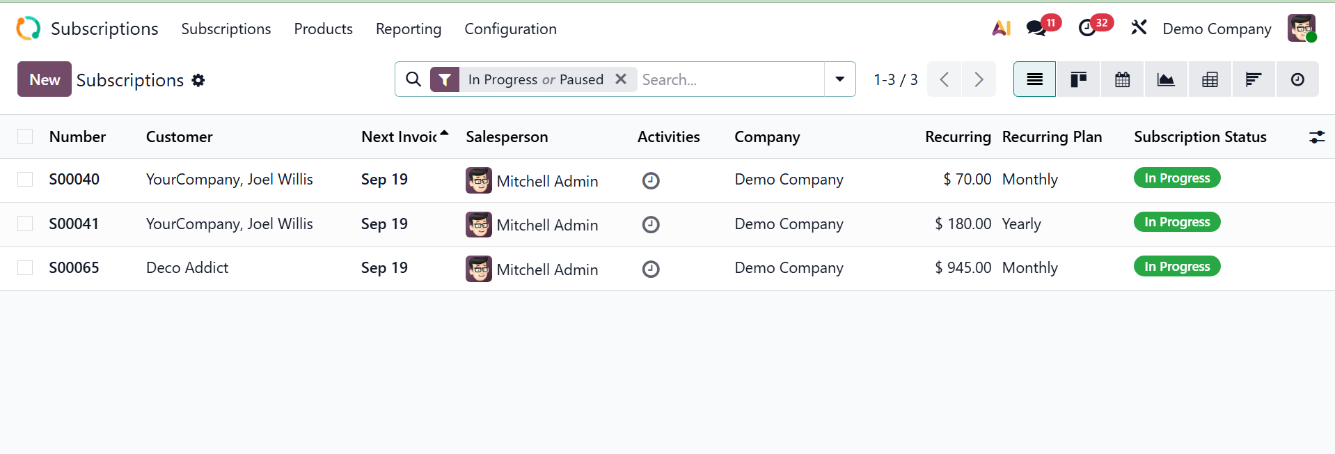 All of the expired subscriptions will be shown on this page. The list view shows the number, customer, next invoice, salesperson, activities, company, recurring, recurring plan, and subscription status. To manage the renewal of a subscription, you can select one from the window.