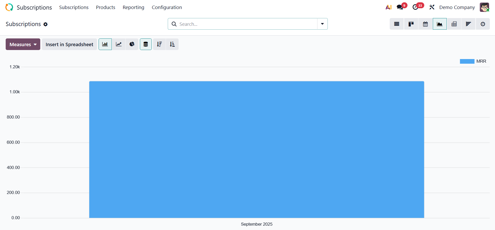 MRR → The MRR smart button is a quick indicator of how much monthly revenue the subscription contributes to your business.