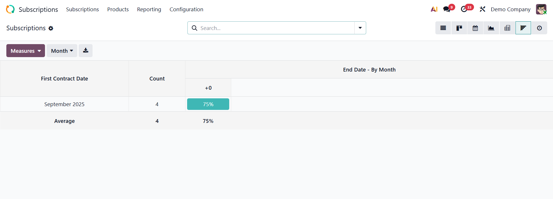 A cohort view would enable the analysis of subscription-related metrics. Here, you have the first contract date, count, and end date by month.