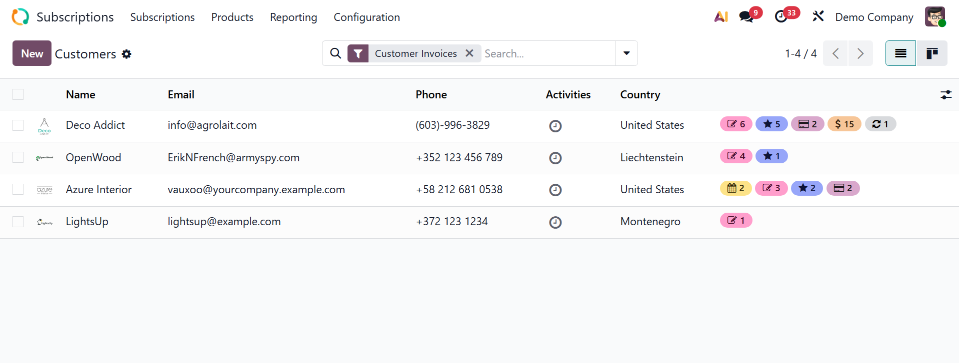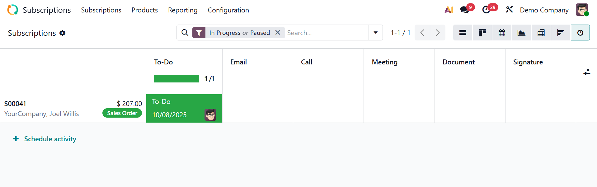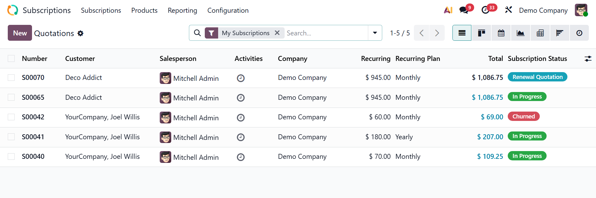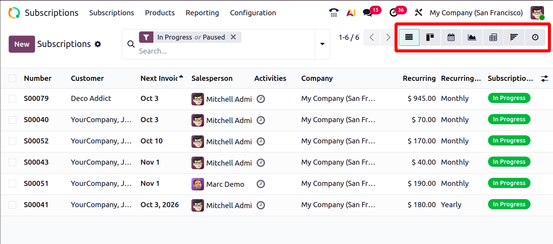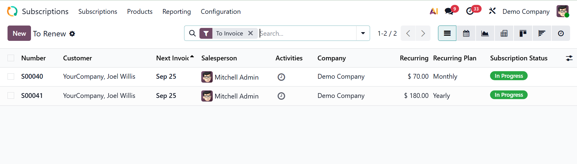 Here, you will get the details like, reference number, customer, next invoice, salesperson, activities, company, recurring, recurring plan, and subscription status, respectively. The pivot view will be, as in the screenshot below.