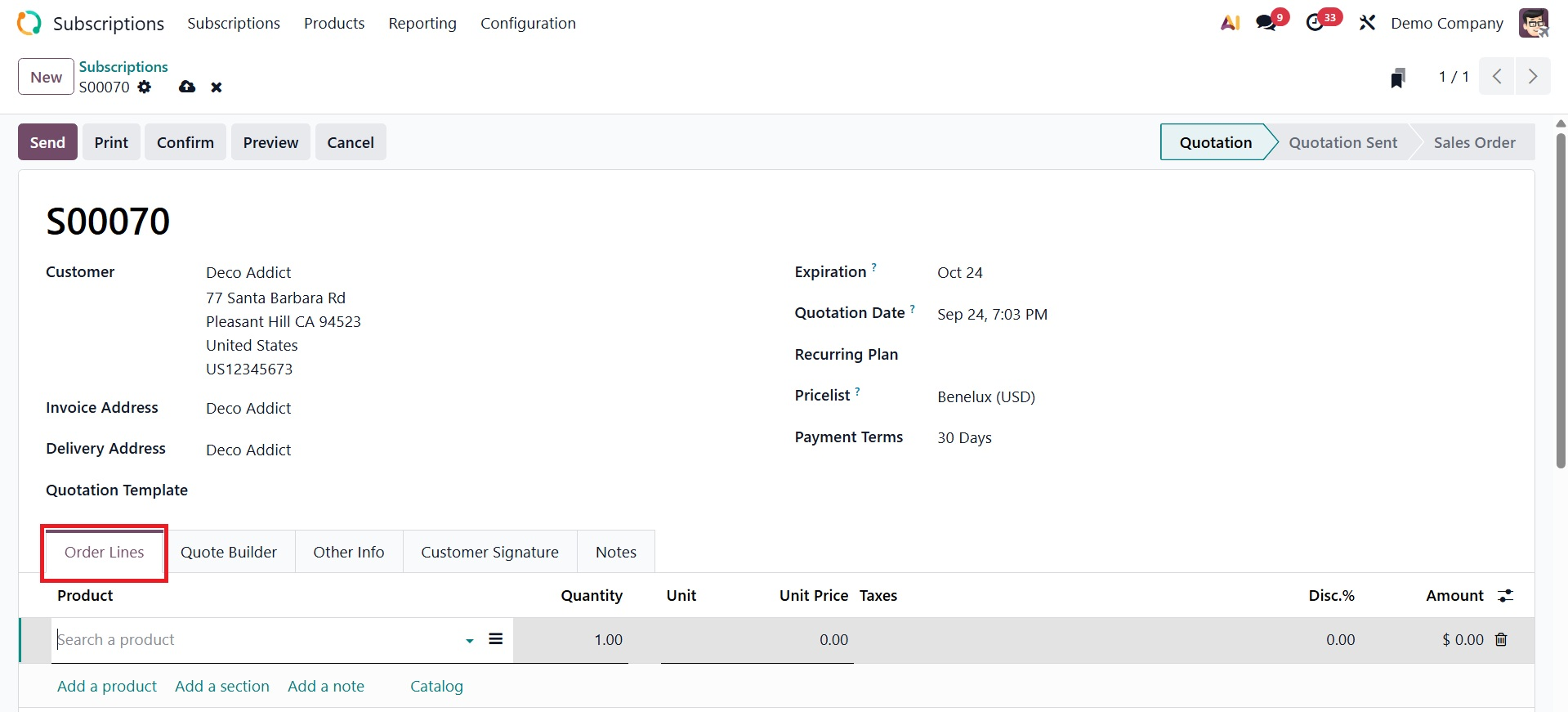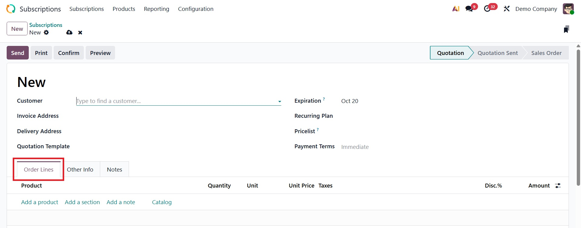 Each subscription product can be listed separately using the Order Lines tab. To add a line for this, click the Add a Line option. This tab shows the product details, quantity, unit, unit price, discount, and amount, respectively, as shown below. Here, you can also make use of the Add a Section, Add a note, and Catalog options.
