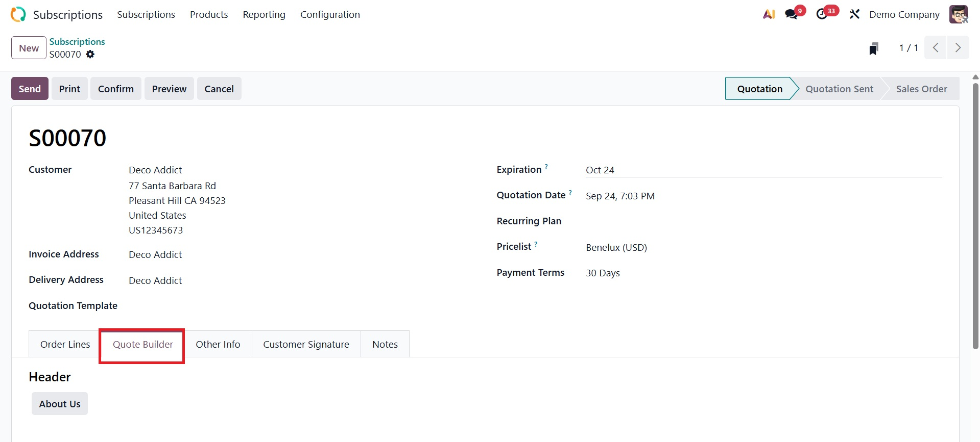 Create a new quotation as explained under the subscription section. When your quote is prepared, you may either confirm it or send it to your clients. It is preferable to send the quote to your clients via email for their approval before confirming it in Odoo Sales.
