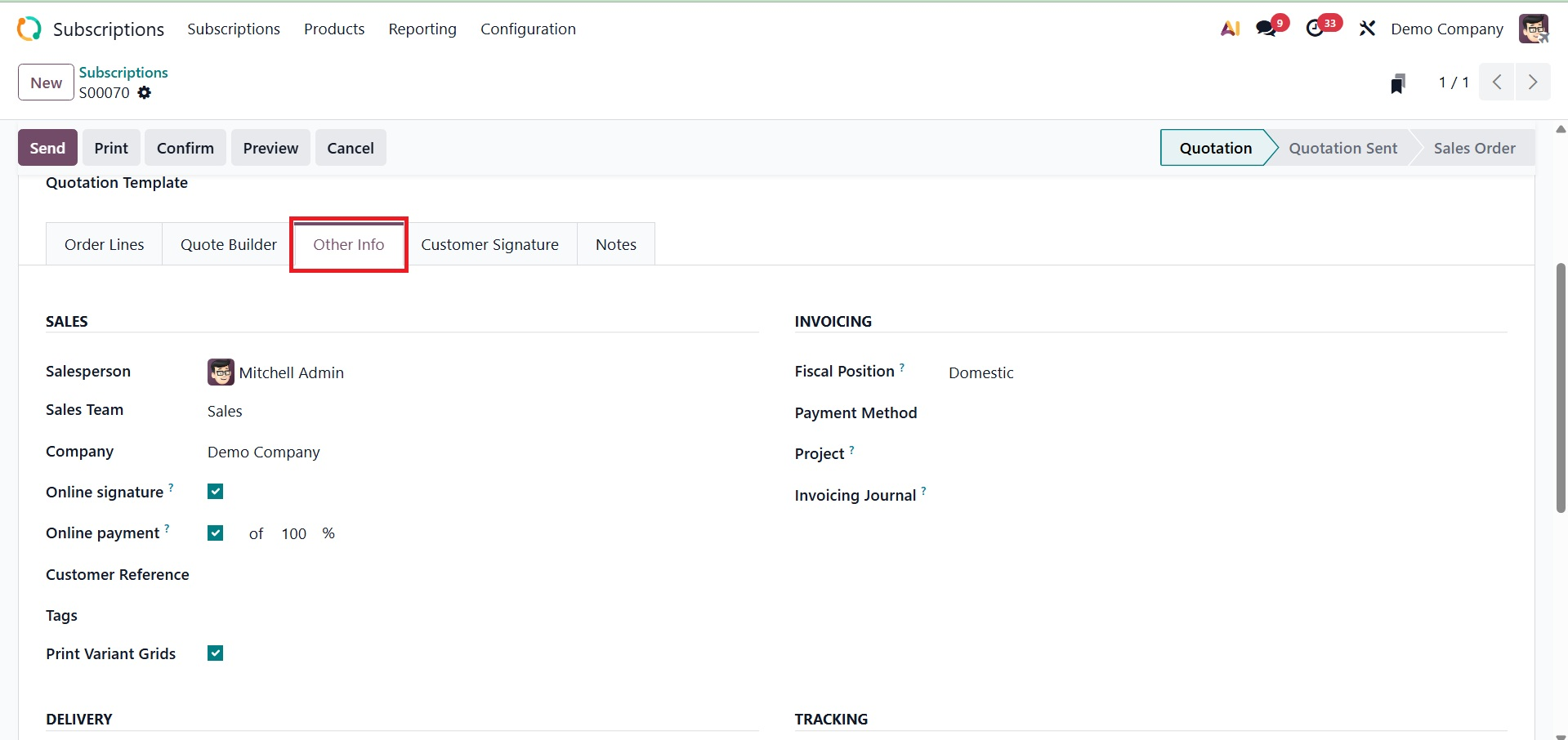The Other Info tab is where you can enter data pertaining to sales, delivery, tracking, invoicing, and payments. Under the SALES session, you can assign a Salesperson and Sales Team to manage this subscription. The company name will be included in the pertinent field. If you want to let the customer sign and complete payment online, you can turn on the Online Signature and Online Payment option from the Online Confirmation box. You can choose which tags are suitable for this particular subscription under the Tags section.