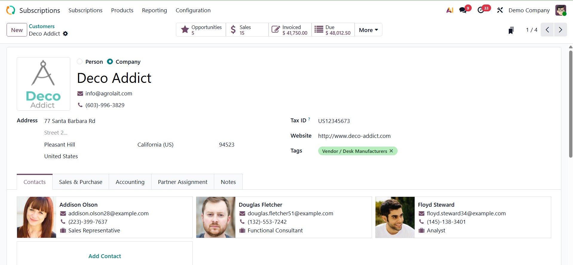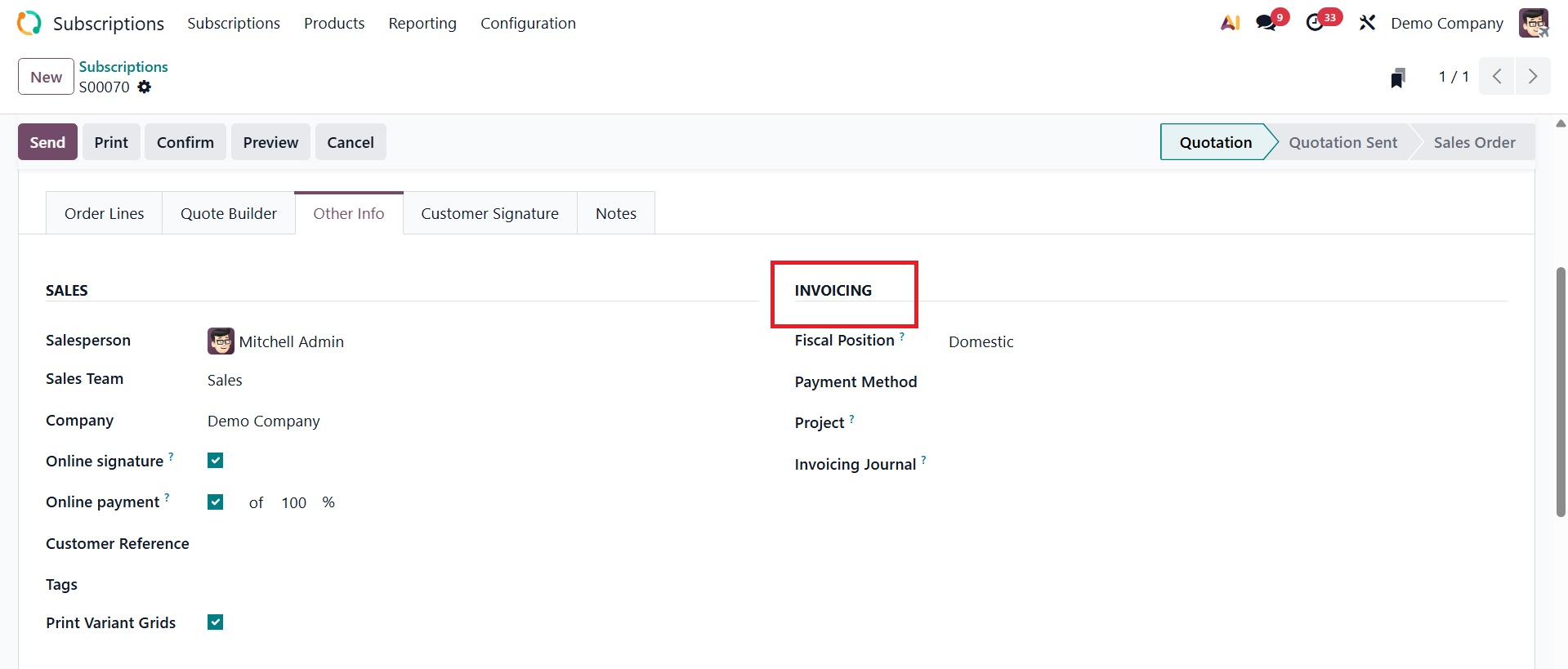 - Fiscal Position: Assign a specific tax and account mapping to the subscription, impacting the taxes and accounts recorded on invoices generated for it.