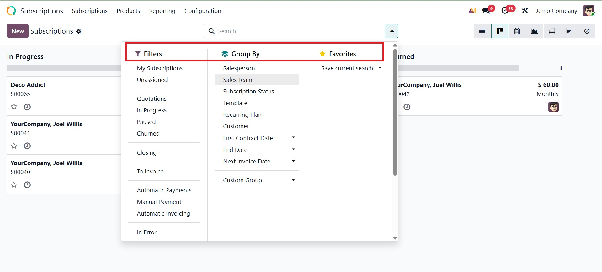 There are several filters available, including My subscription, Unassigned, Quotations, In progress, paused, churned, closing, to invoice, automatic payment, manual payment, automatic invoicing, and in error. The Group By option, which offers choices for Salesperson, Sales Team, Subscription status, Template, recurring plan, Customer, first contract date, End Date, Next Invoice Date, and Custom Group, respectively. You can also include them into favourites if required.
