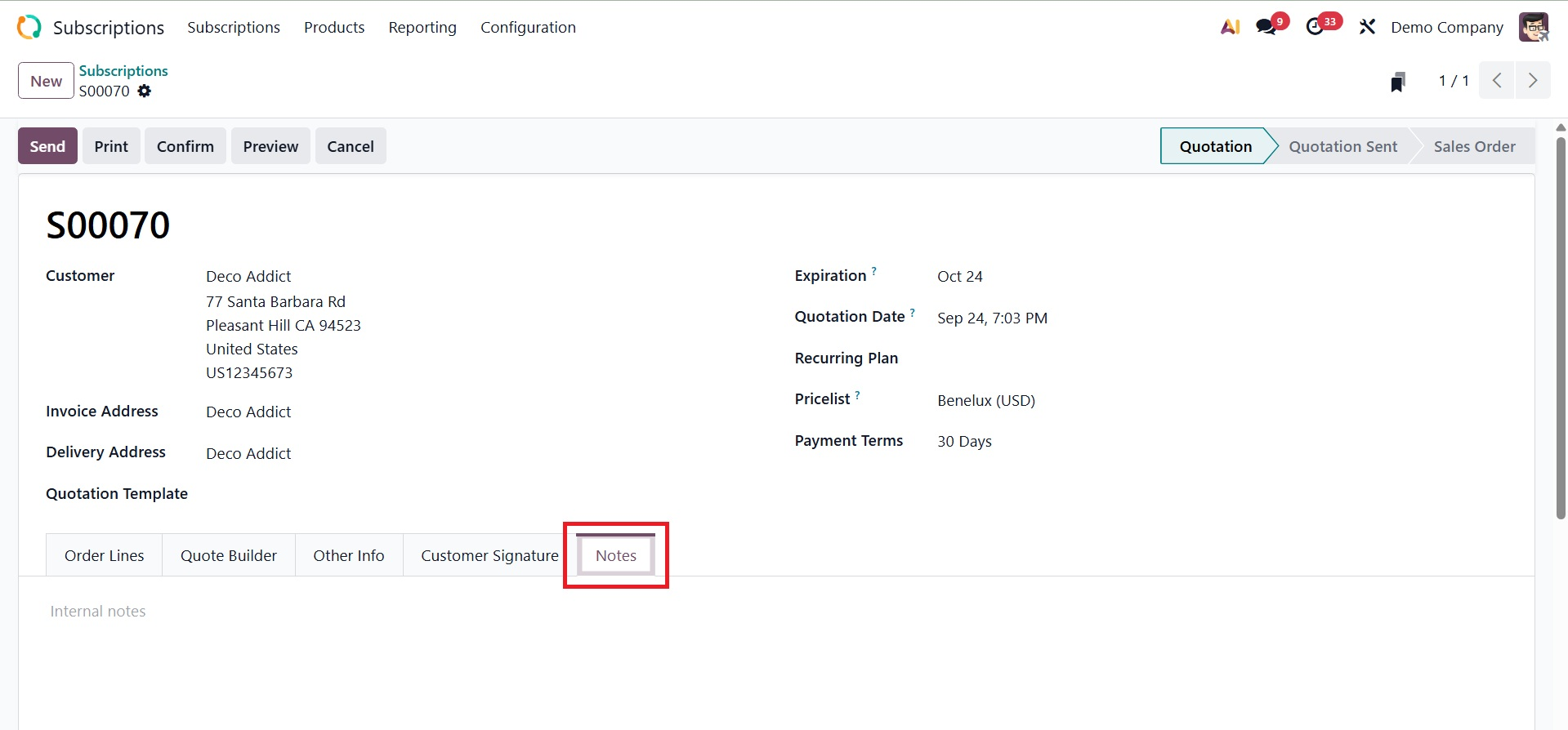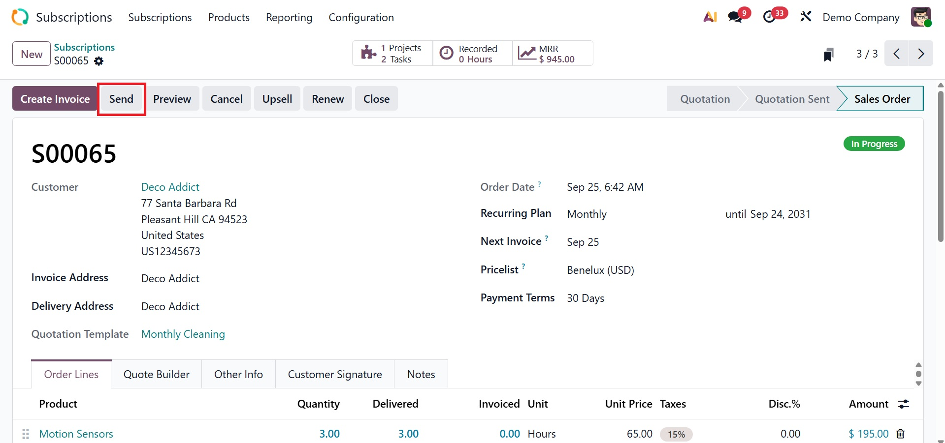 On confirming, the status changes to sales order. The Send option will transmit this quotation to the customer who has been selected.
