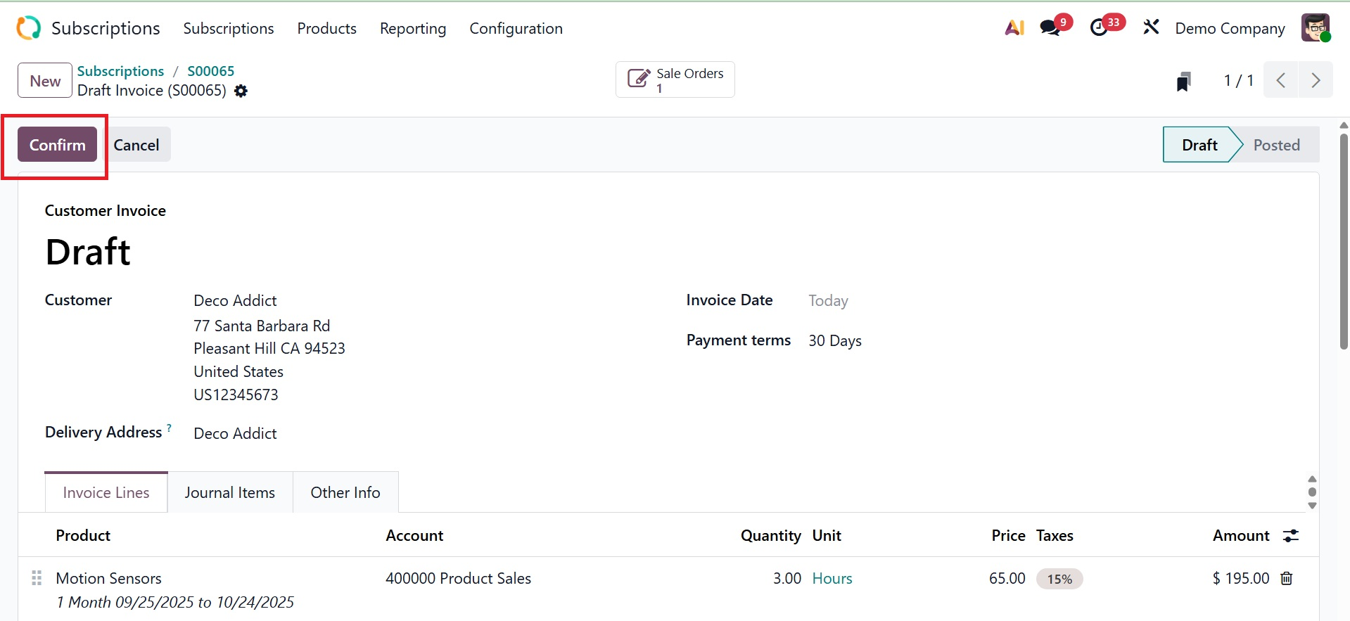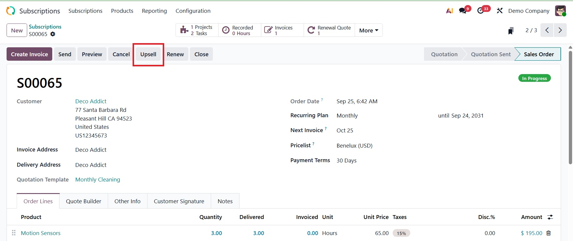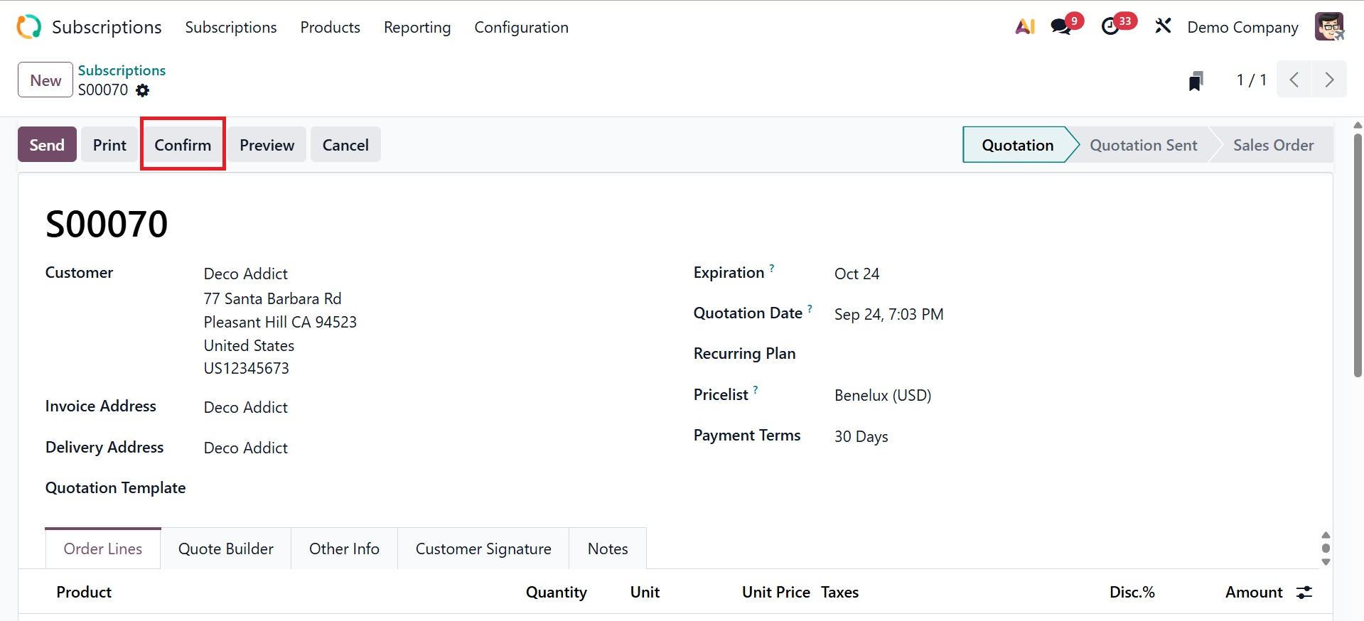Once the client has given their permission, you can convert the quotation into a sales order by clicking the Confirm button. The new upsell goods will be added to the subscription as soon as you confirm the order.