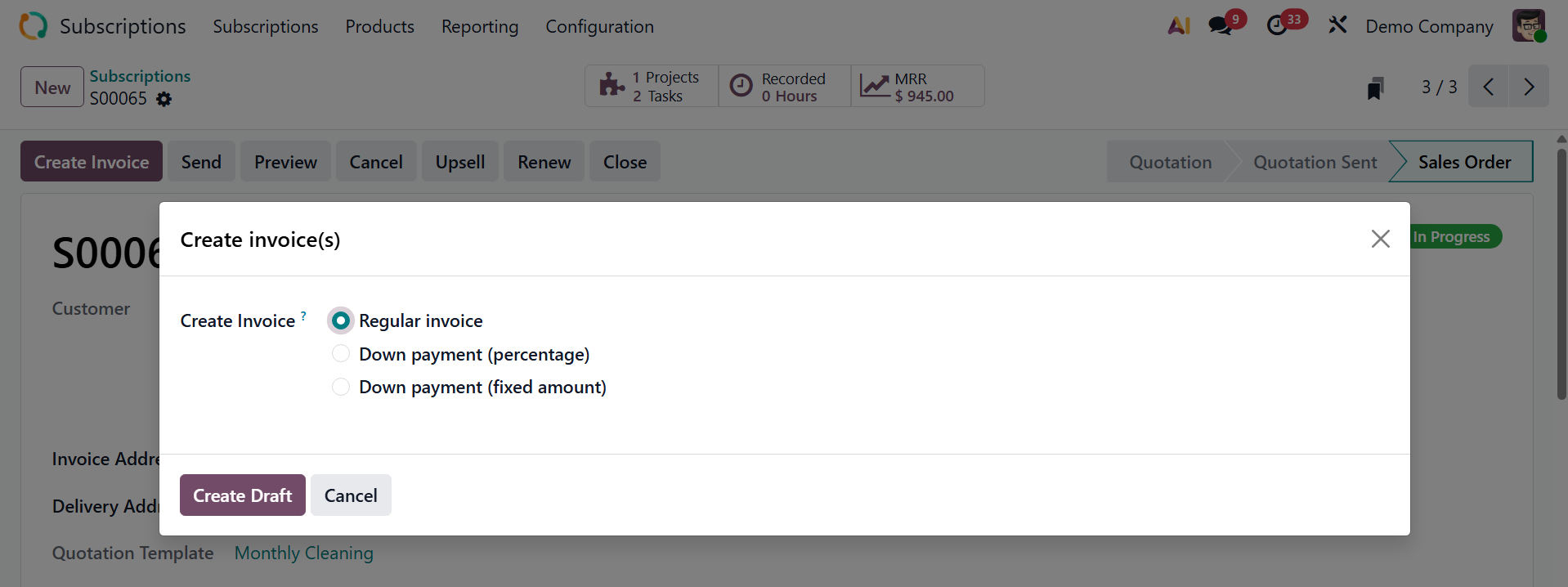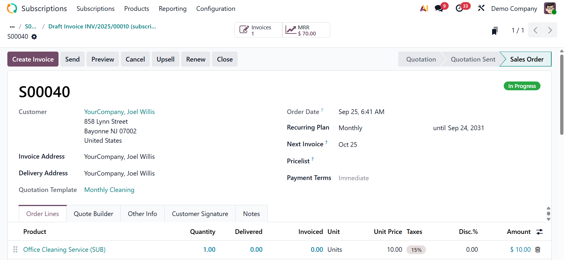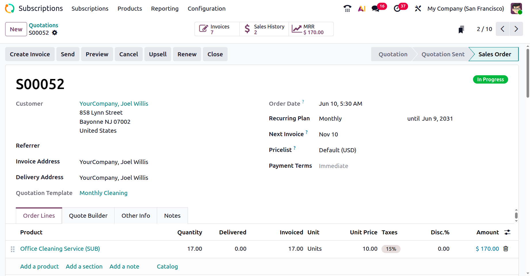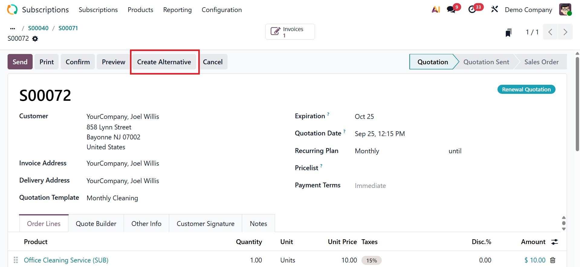 - Quotation Template: The sales quotation that started the subscription is referred to as the quotation (Monthly Cleaning or Yearly Cleaning). It guarantees the subscription adheres to the fee and length specified in the terms of service, including whether the customer signed up for a monthly or annual cleaning plan.