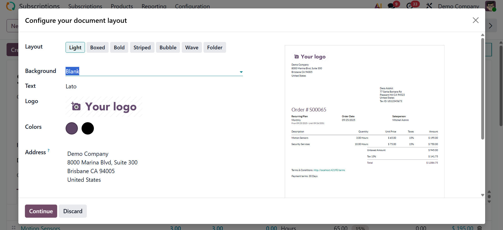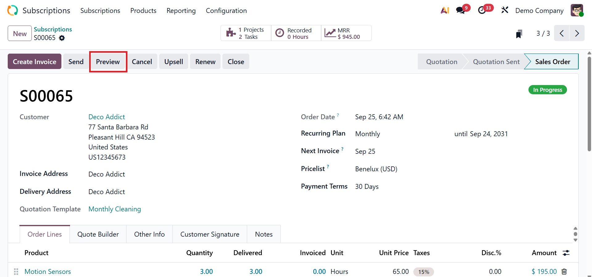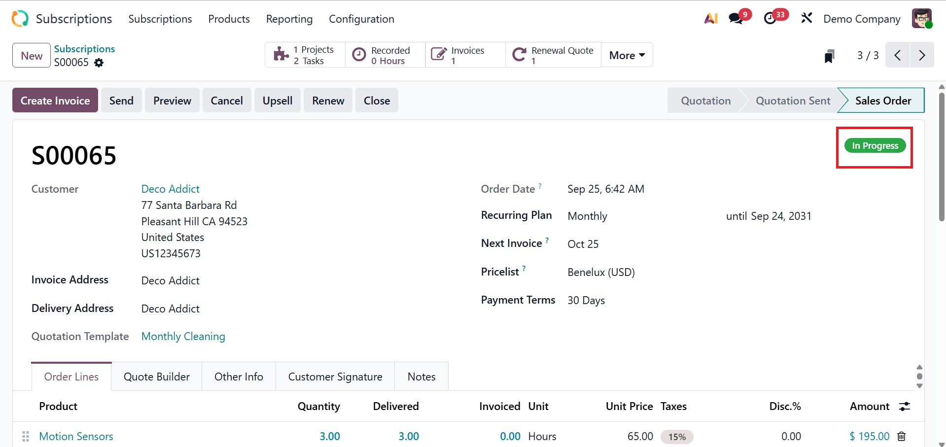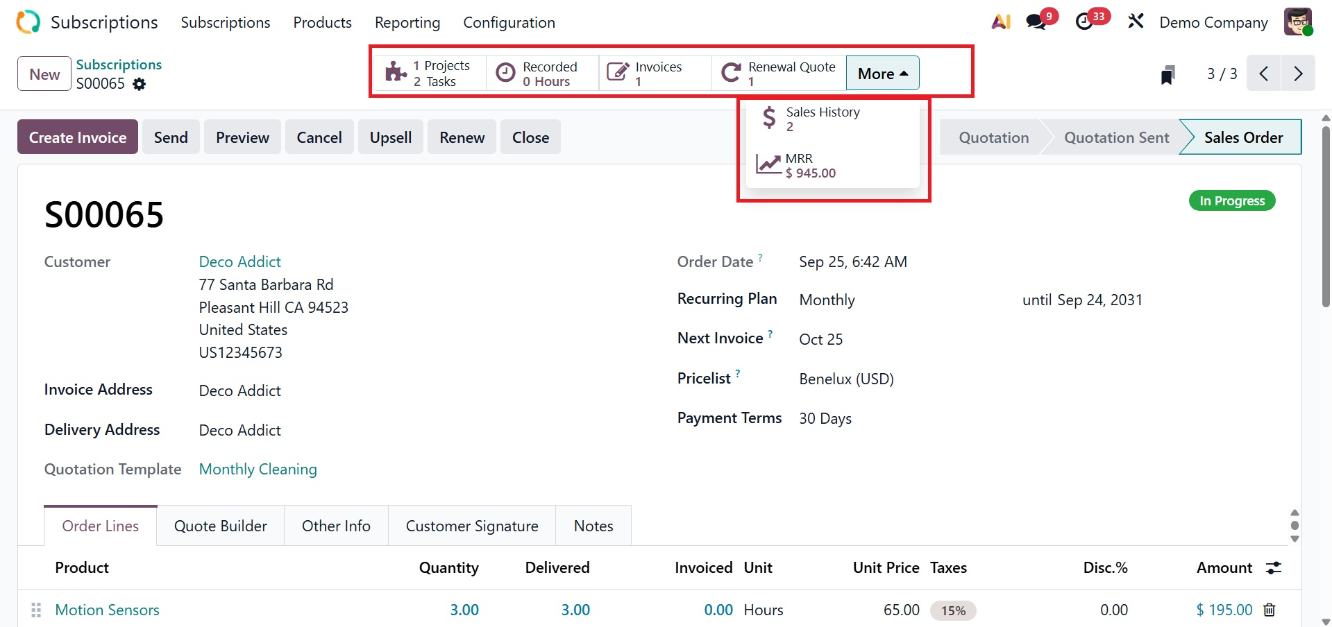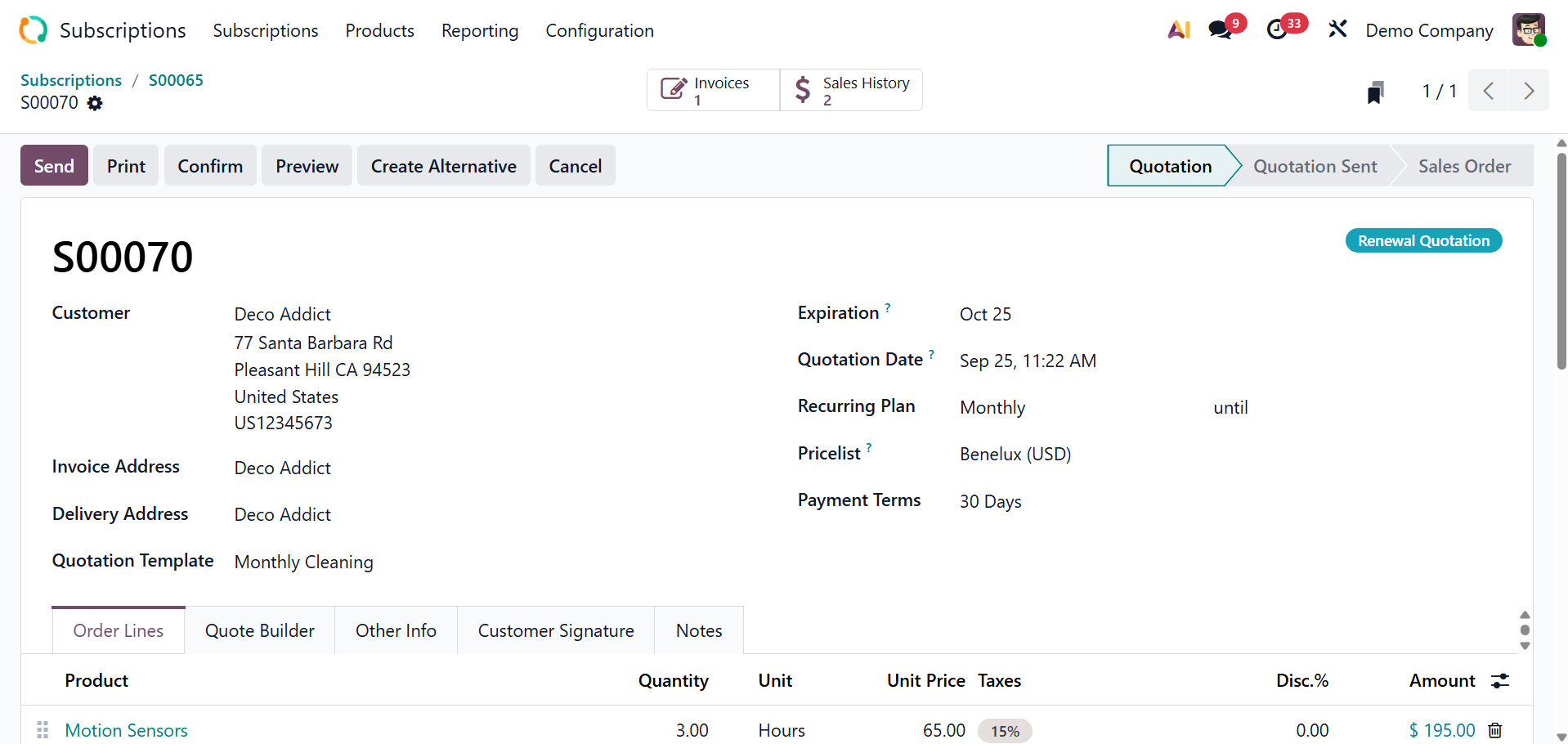 - Quotation Template: The sales quotation that started the subscription is referred to as the quotation (Monthly Cleaning or Yearly Cleaning). It guarantees the subscription adheres to the fee and length specified in the terms of service, including whether the customer signed up for a monthly or annual cleaning plan.