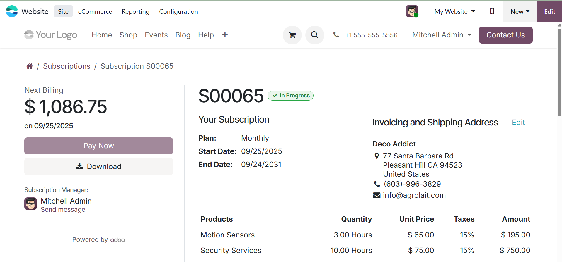 - Customer: field on the subscription form that indicates which Odoo partner—a person or business—will be invoiced for the subscription service.