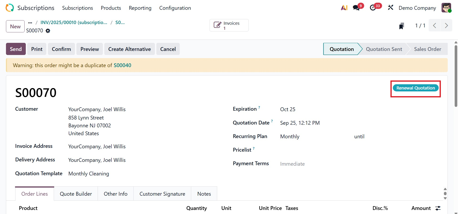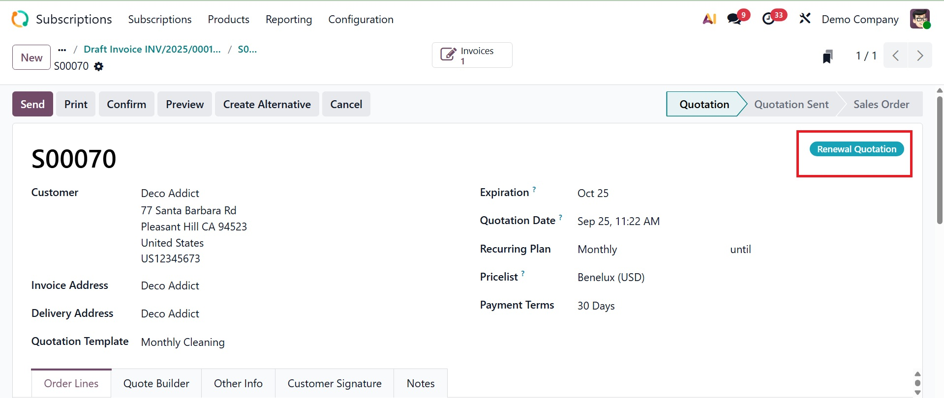 By selecting the Renew button, you can extend your subscription. On selecting the option, the stage changed to renewal quotation, as shown below.