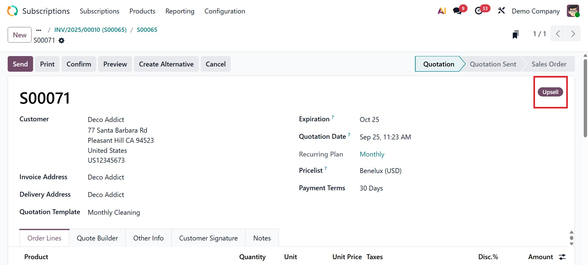 As can be seen in the image above, the Upsell button is situated in the form view. An upsell product quotation will appear when you click this button. It is possible to add new products to this quotation. The quotation for the new products can be submitted to the appropriate customer for approval.