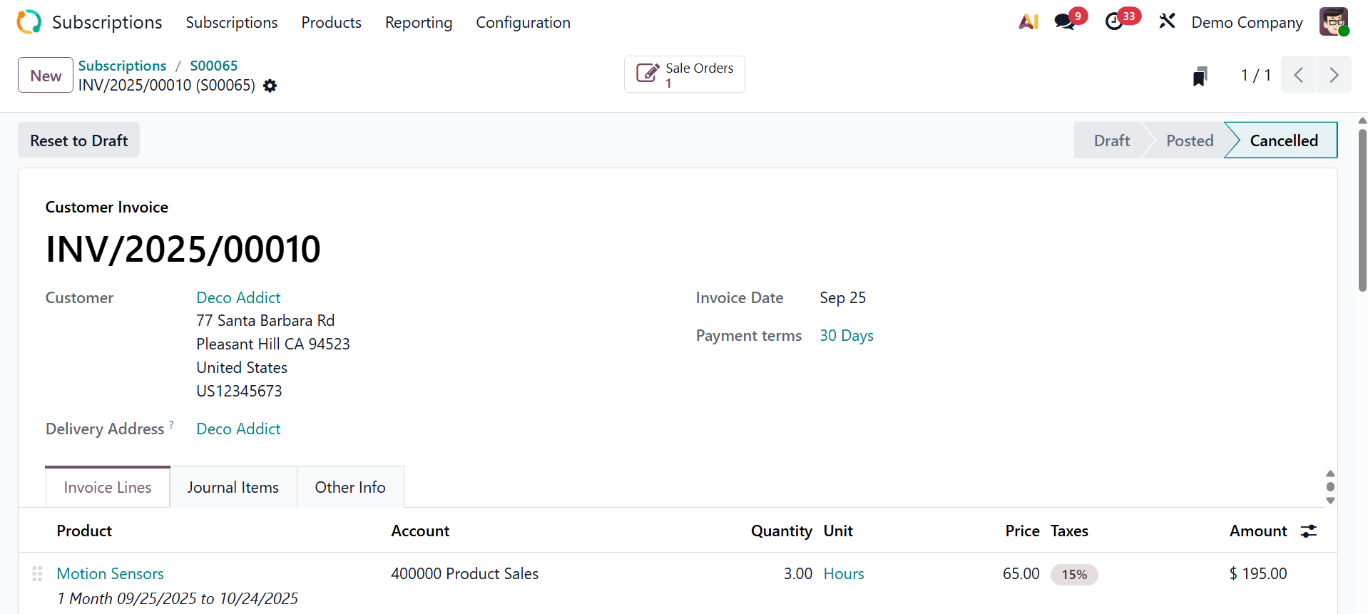 - Invoice Address: The customer's billing address. Invoices produced by the subscription will be mailed here.