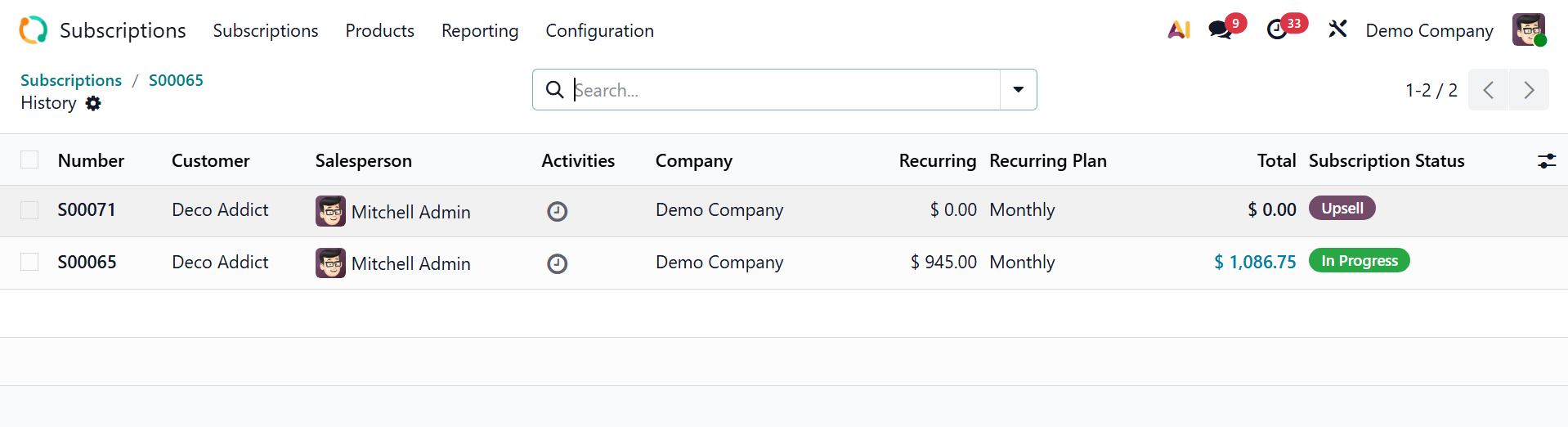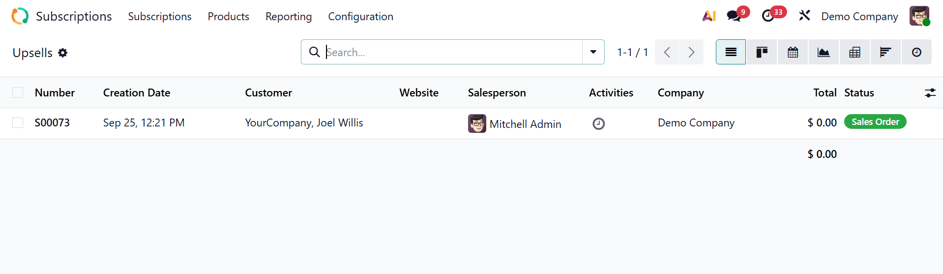 An effective marketing strategy for increasing sales of a company's products is the upsell. You can upsell current subscribers to new ones by incorporating additional offers and subscription items. You can use this to provide your clients with more useful and practical products. The Subscription menu of the module has the Upsells option. This platform will show the list of sales orders generated for upselling items.