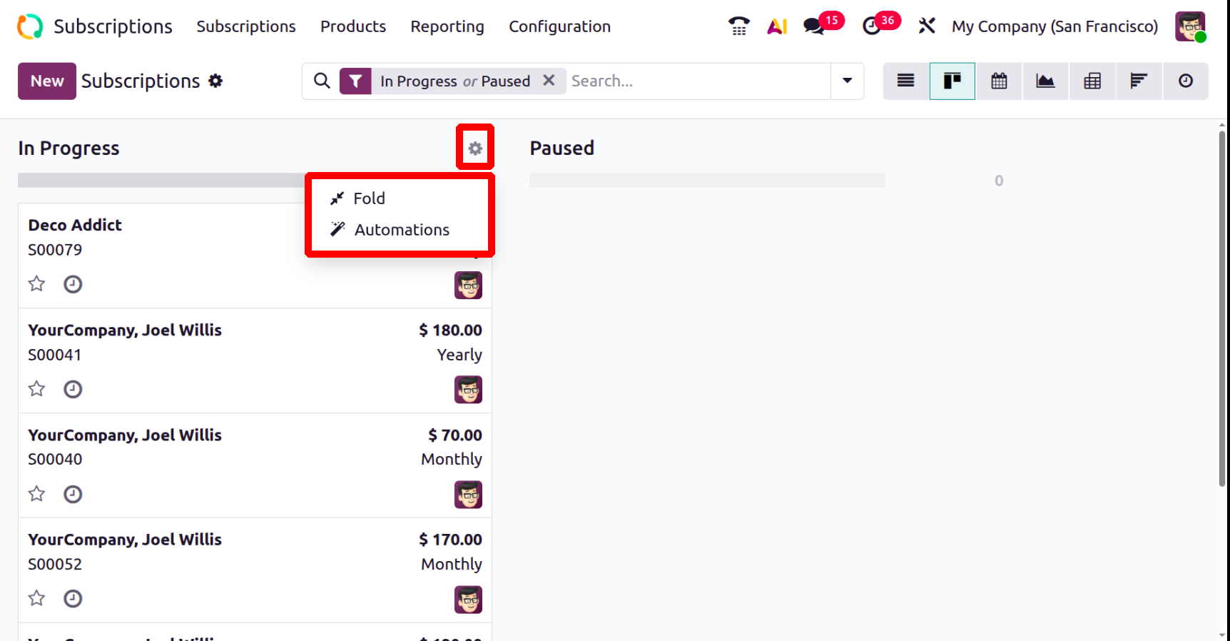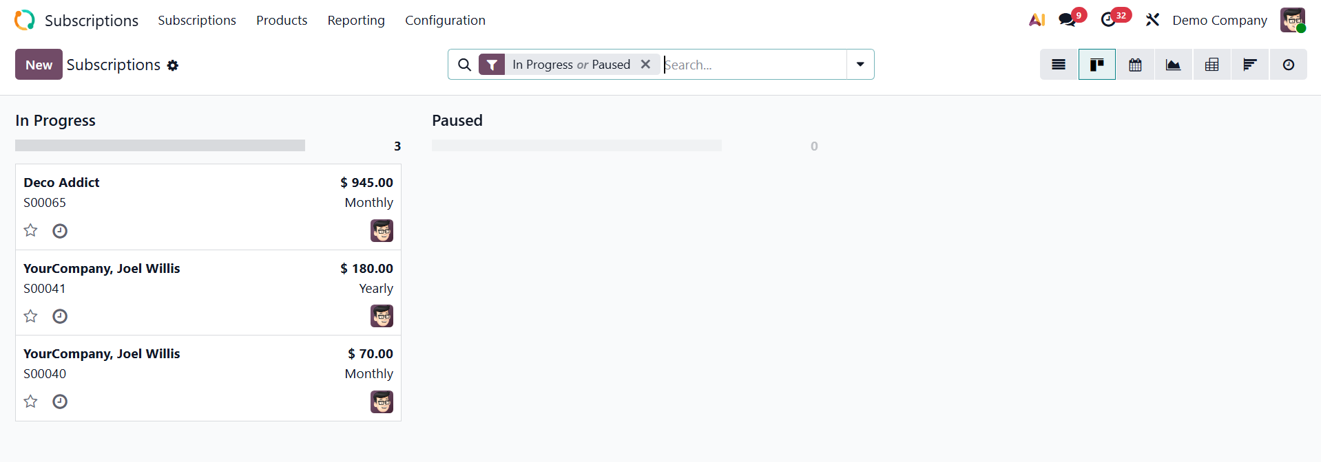 The Kanban view on this platform allows you to look at different clients' subscriptions at different levels. Here, you have the details regarding the name of the customers, recurring plan, recurring amount, and many more. You can examine the subscriptions of various customers under various phases using this platform's Kanban view. To construct further stages, you can make use of the New icon as well.
