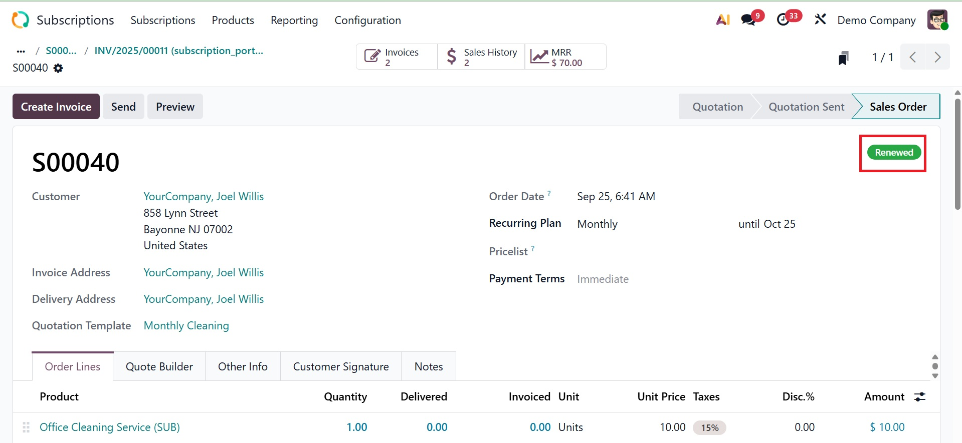 The form view of the renewal window will show up, as shown in the screenshot. You can view the subscription's current status here. The renewal transaction can be completed by clicking the Renew button. The sales order for the subscription renewal that is shown below will result from this.
