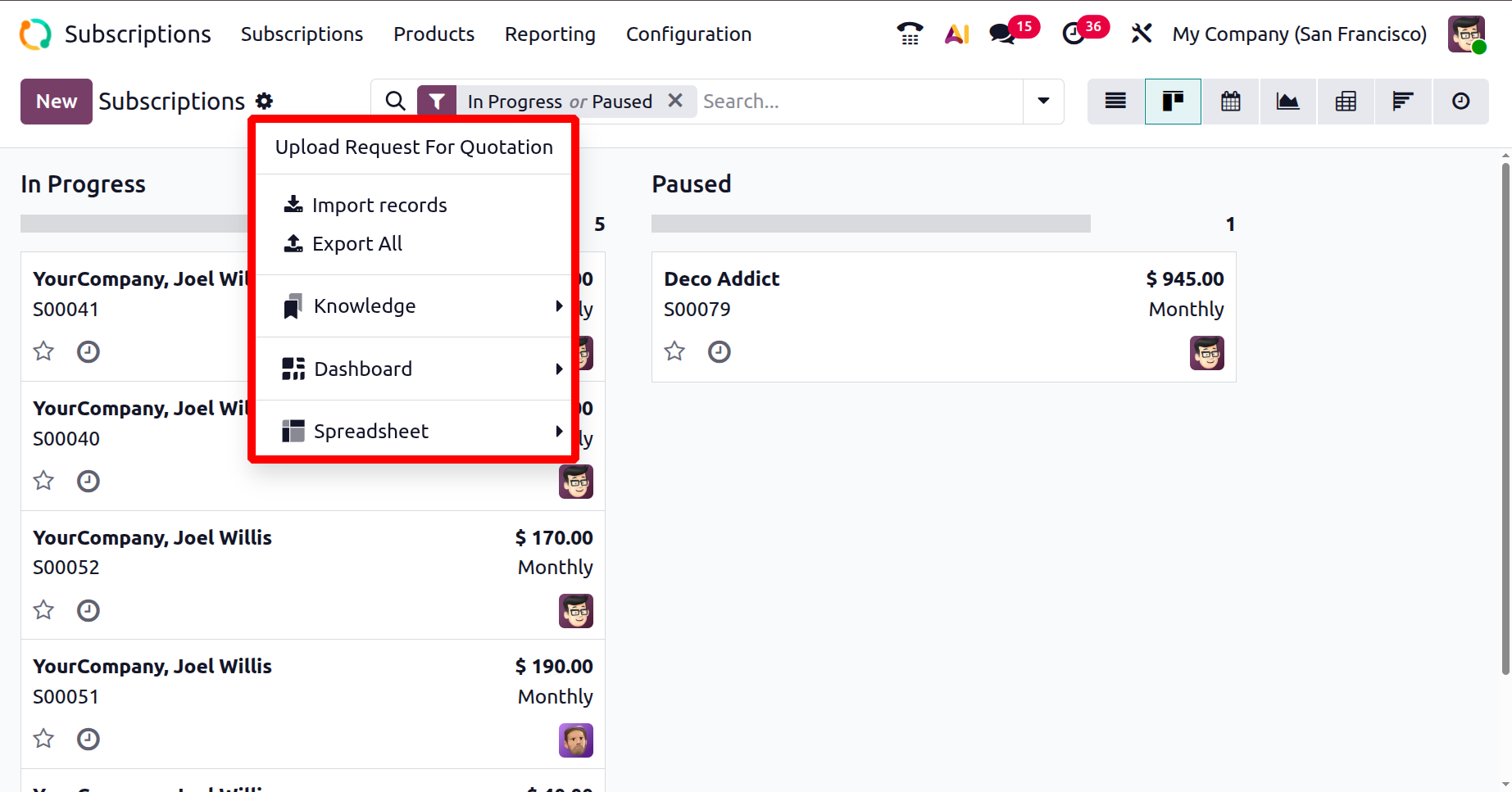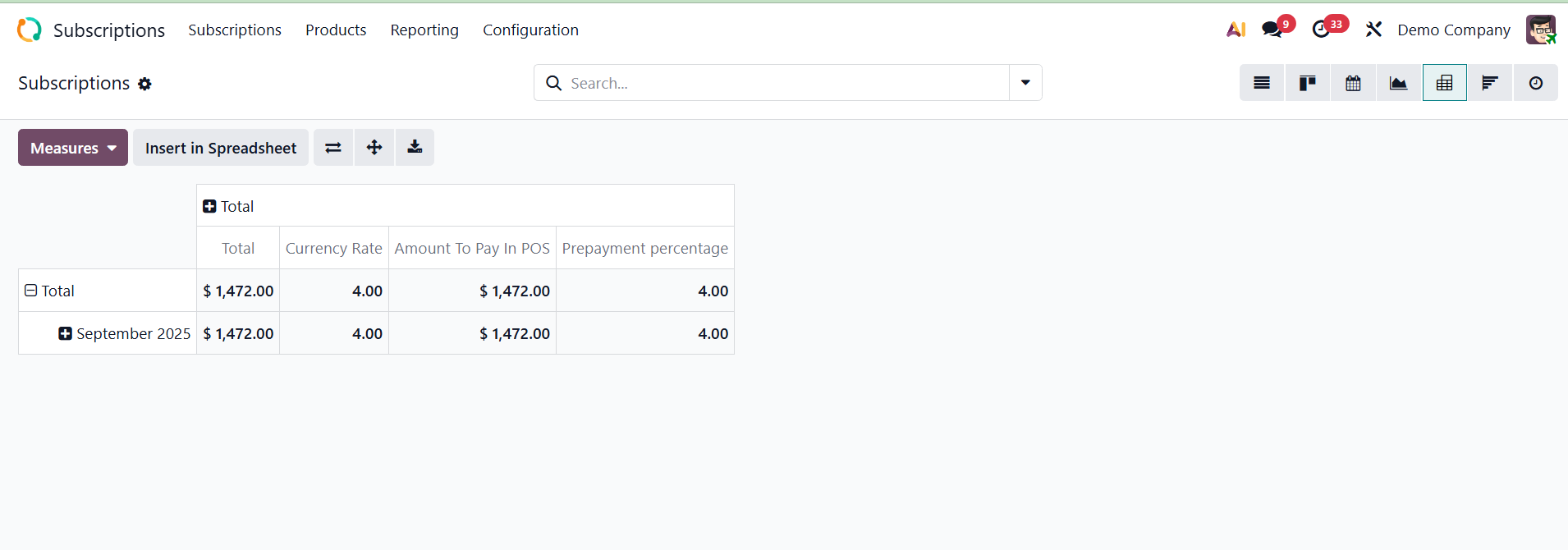 - Spreadsheet :Check and analyze subscription data in a sheet inside Odoo (like Excel.