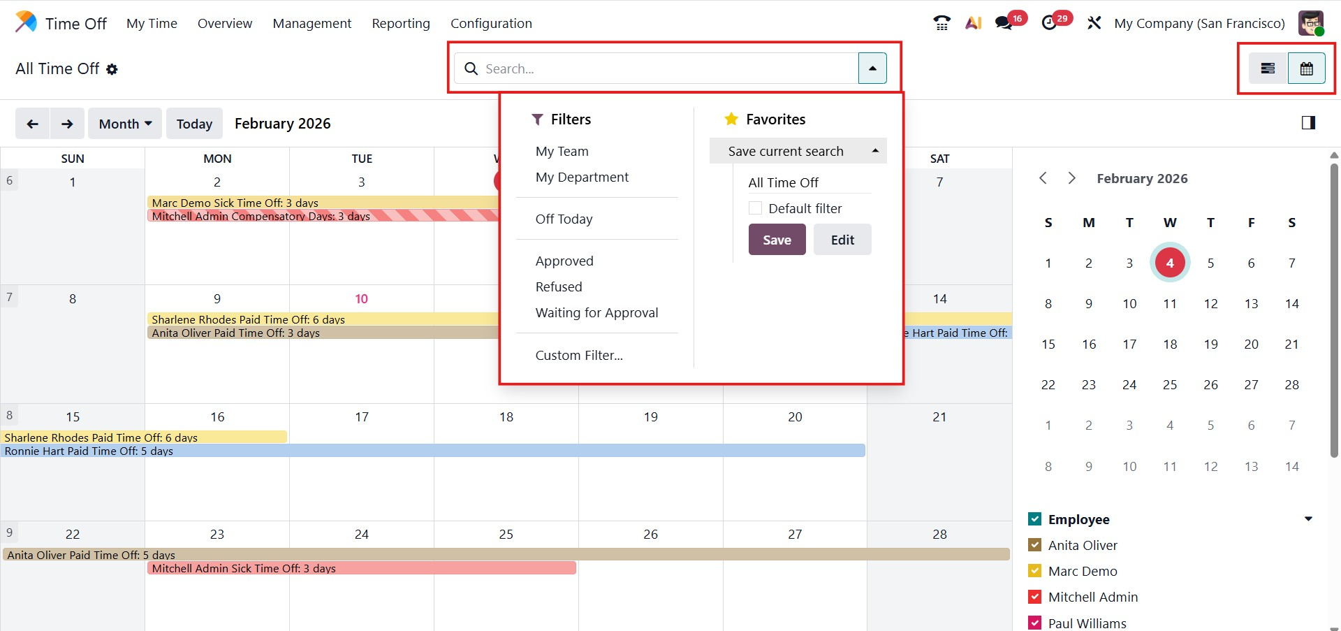 The advanced search bar includes filters such as My Team, My Department, Off Today, Approved, Refused, and Waiting for Approval, allowing users to quickly find specific records. Custom filters can also be created using the Add Custom Filter option. Important searches can be saved using the Favorites option for quick access later.