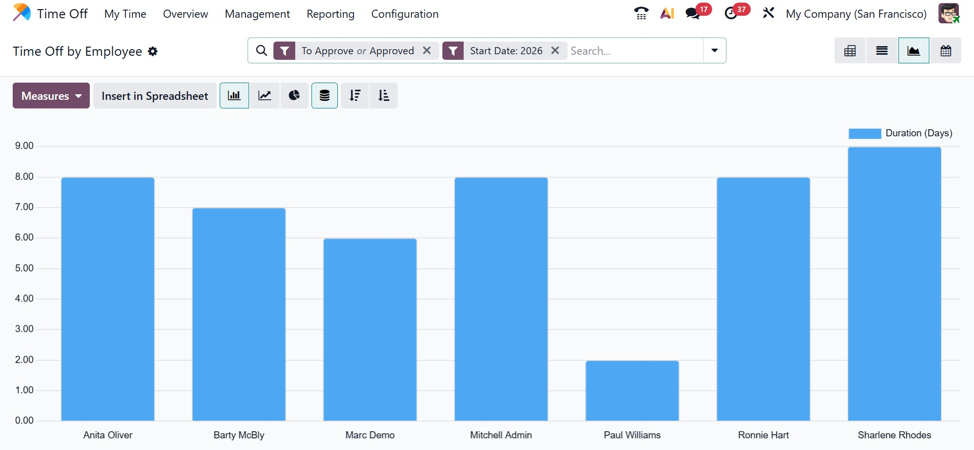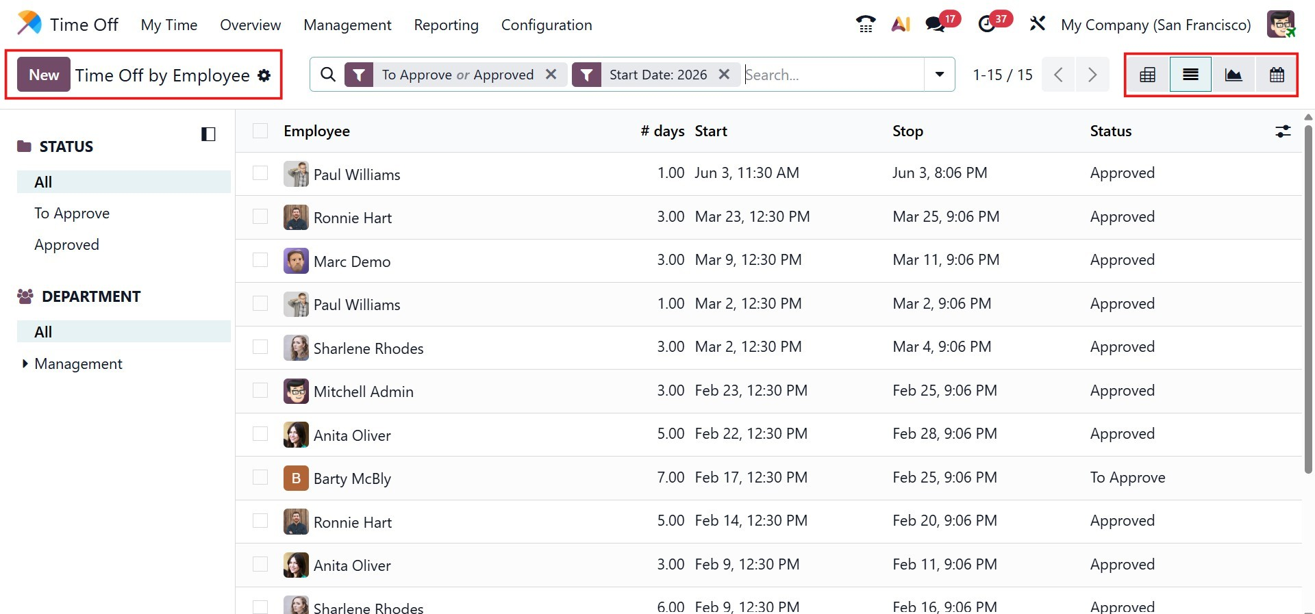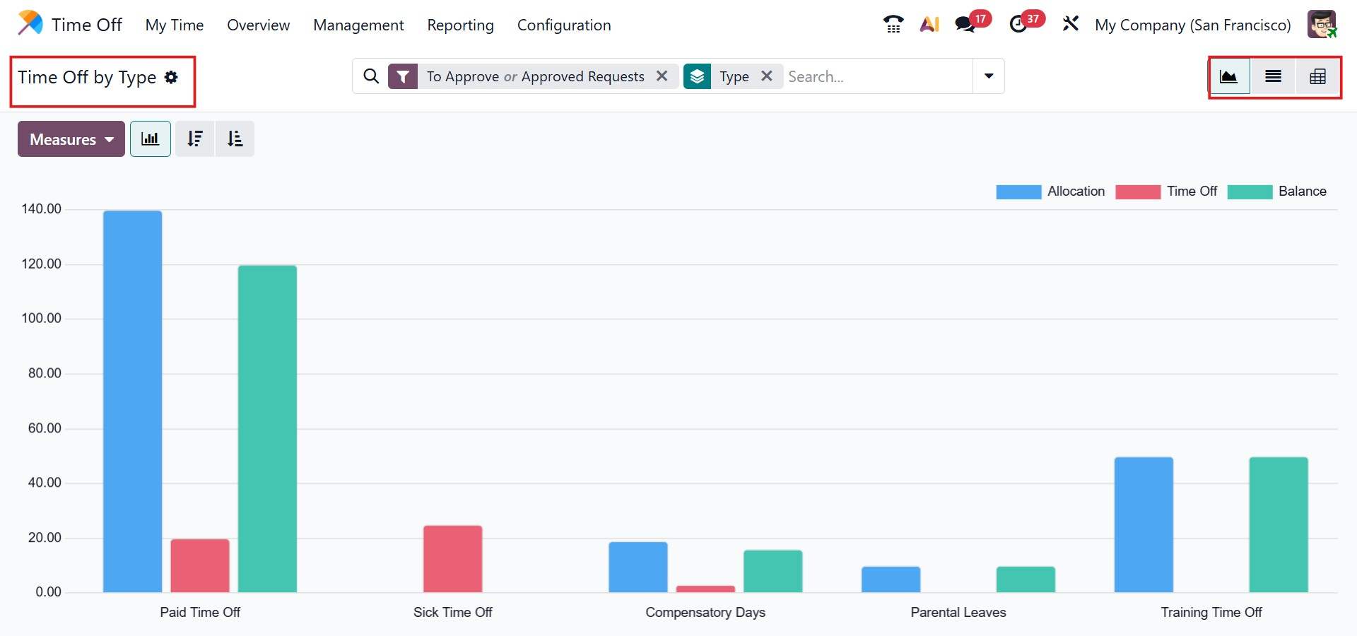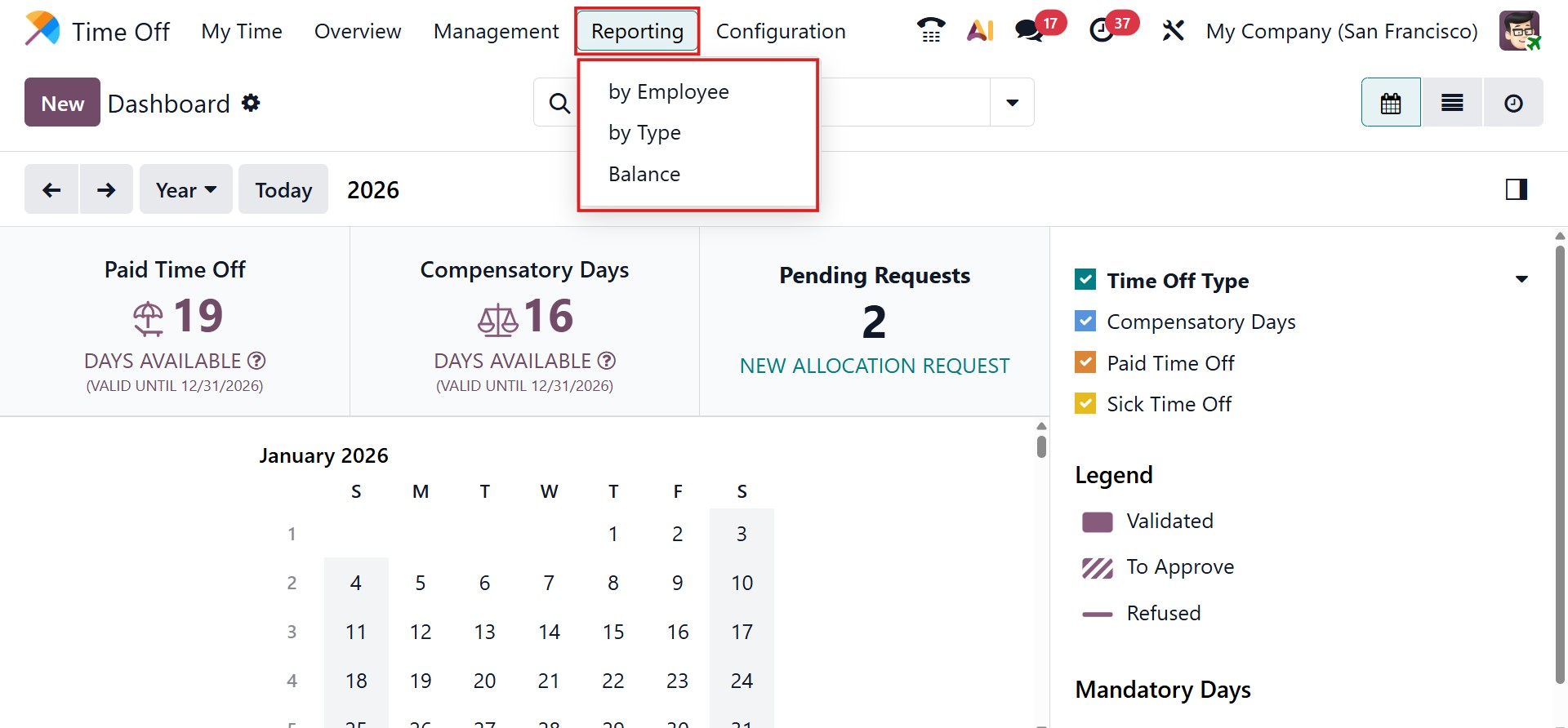 The Reporting menu in Odoo 19 Time Off provides powerful tools for analyzing employee leave data. Reports are available by Employee, by Type, and Balance, and can be viewed in Graph, Pivot, List, or Calendar formats. Users can refine reports using filters such as employee status, department, and year. These reporting tools help organizations track leave trends, improve planning, and manage time off more effectively.