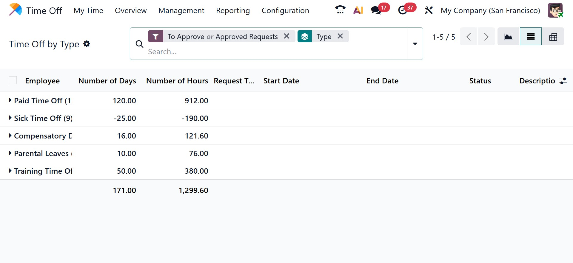 The dashboard summarizes employee leave data by Time Off Type, showing leaves already taken and those still pending approval. By combining allocation, approval, and reporting features into one system, the Odoo 19 Time Off module simplifies leave management for both employees and HR managers while ensuring accuracy and efficiency.