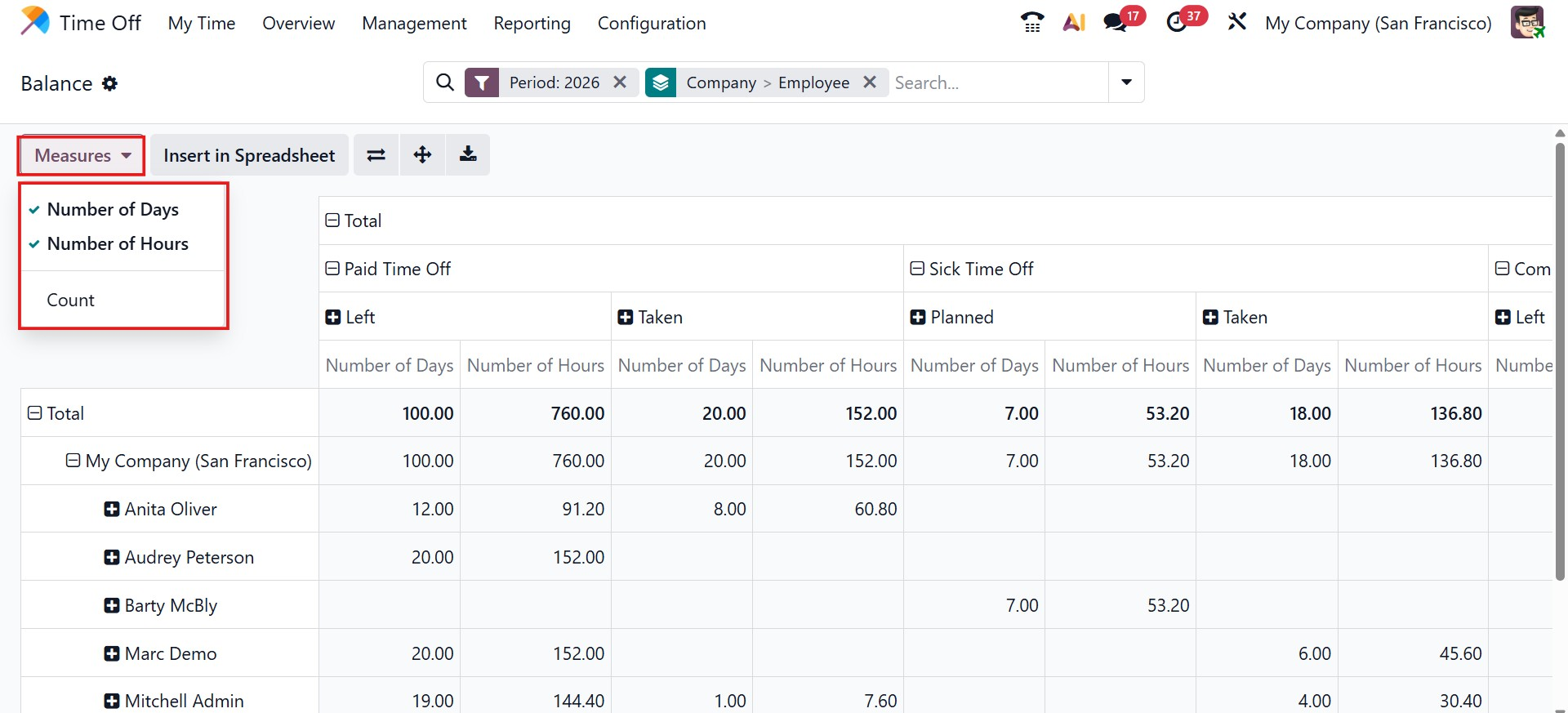 The Time Off Analysis by Balance feature in Odoo 19 provides a clear overview of employee leave balances. It allows HR teams to monitor available leave, used leave, and pending requests in real time. This report supports workforce planning, policy compliance, and smooth payroll processing through its integration with other HR modules.