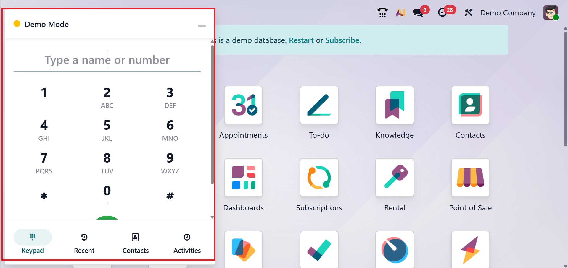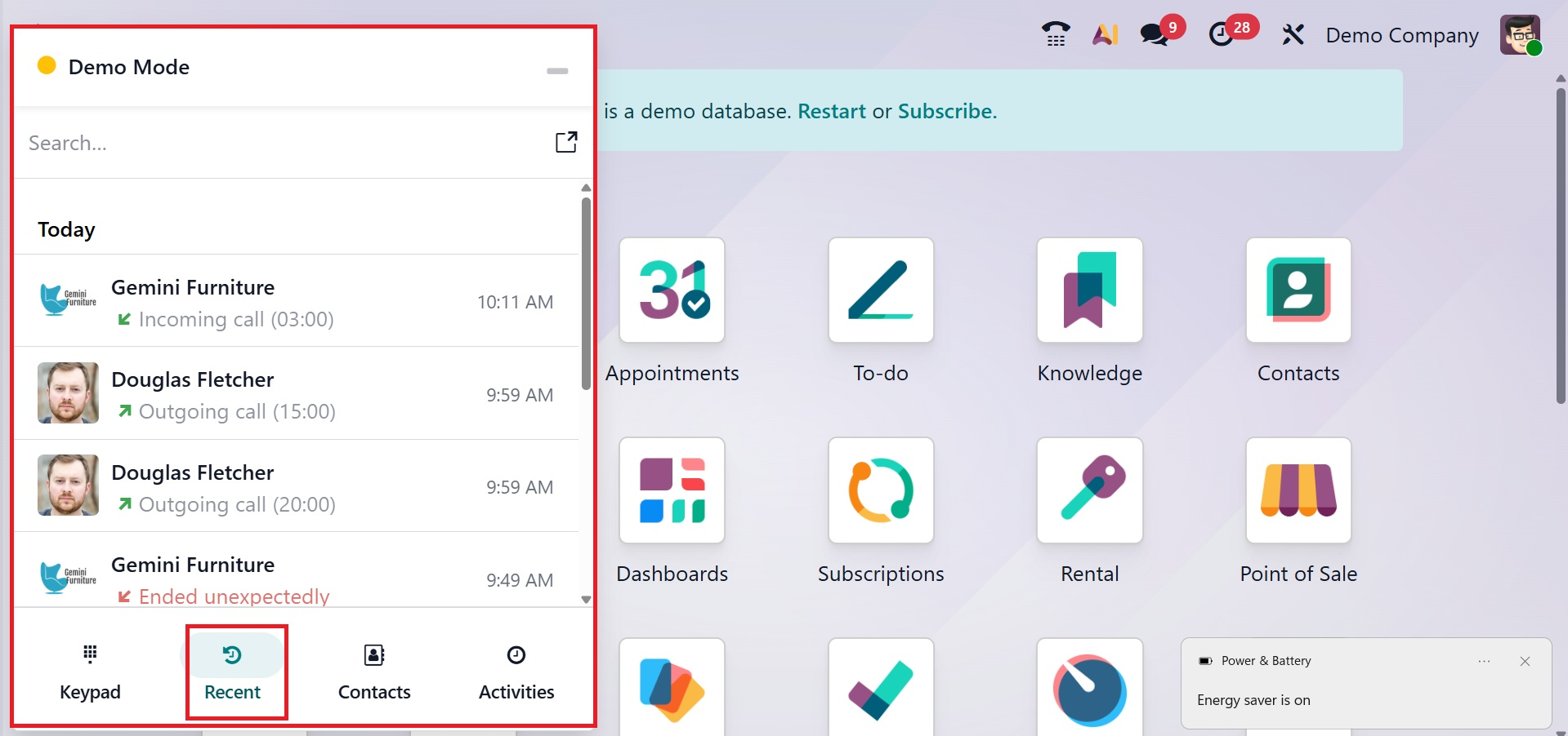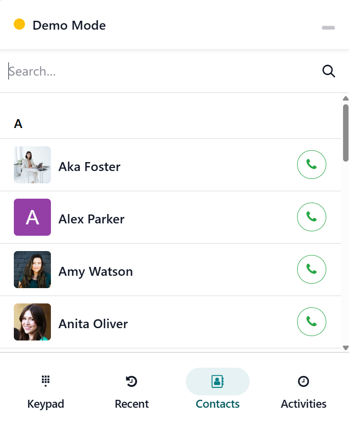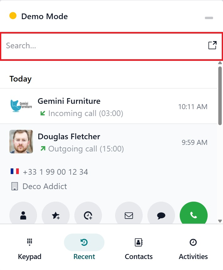 A tiny VoIP window will appear when the user clicks on the phone sign. Keypad, Contact, Activities, and Recent are the four tabs that make up the interface.