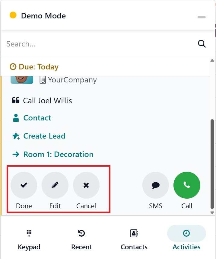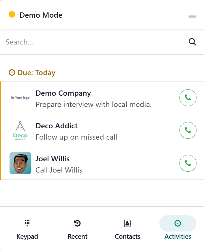 The Activities tab displays the due call logs, as shown below.