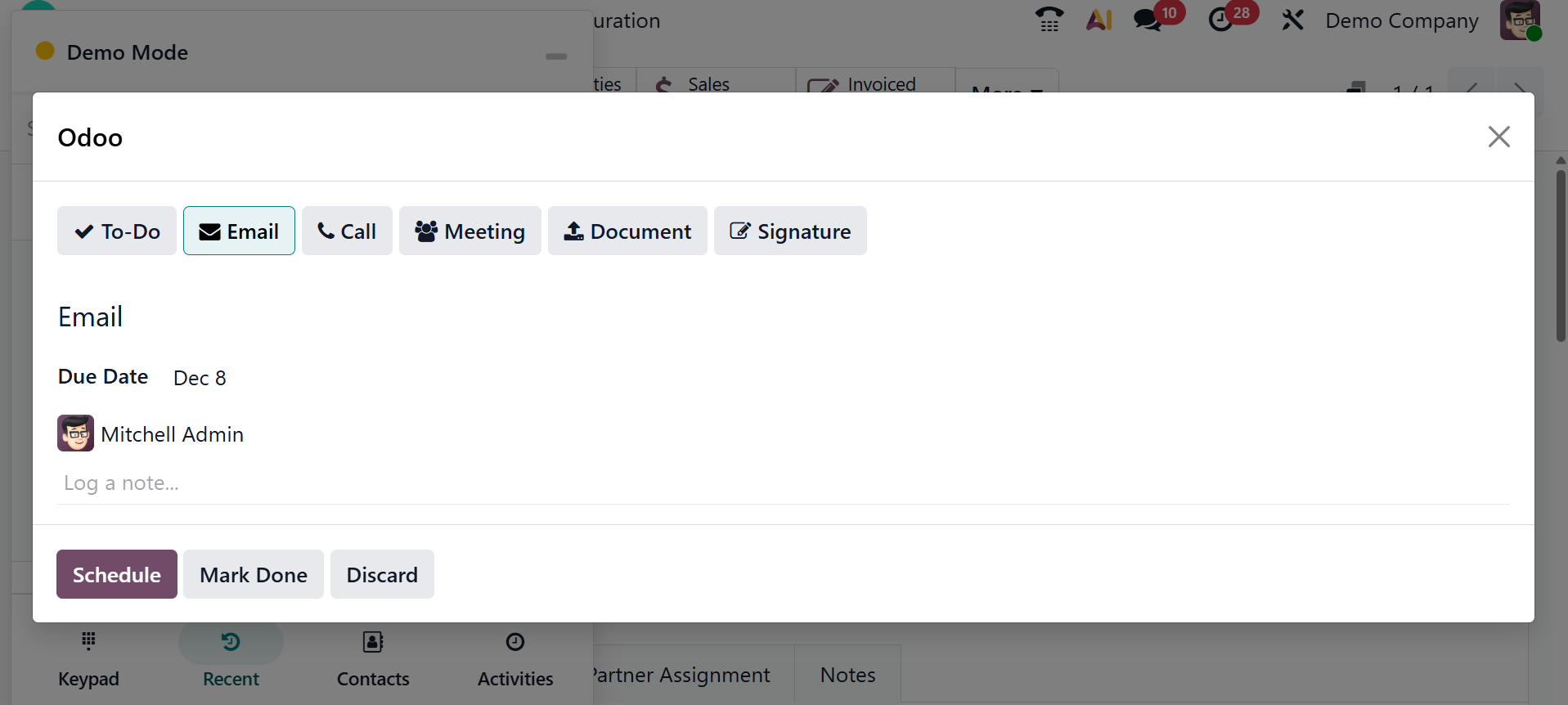 Using the third button on the Activity screen, choose the Activity Type, Due Date, Summary, and Assigned Person to create new activities.